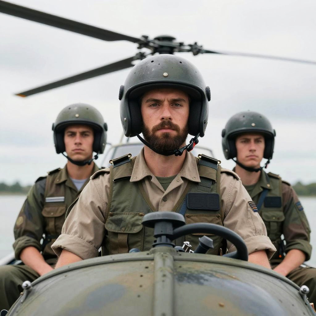 Multiple boys, 3boys, helmet, realistic, male focus, facial hair, hat, sky, watercraft, aircraft, vest, beard, outdoors, cloud, boat, shirt, uniform, 4boys, military, motor vehicle, parody, helicopter