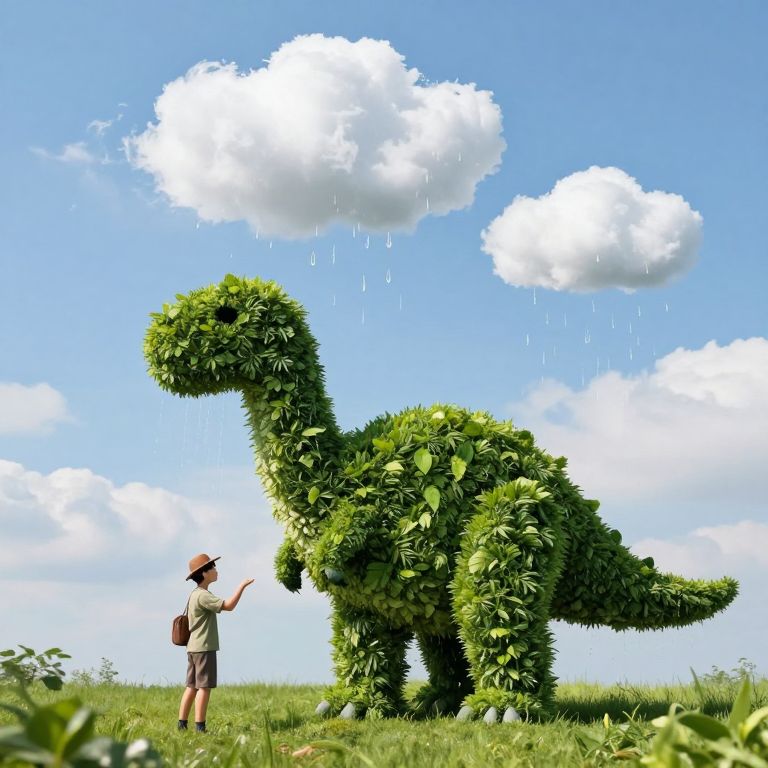 A vibrant digital illustration depicts a young boy with a brown backpack and red hat standing on a grassy field, gazing at a dinosaur-shaped bush. The bush is lush and green, with large leaves forming its body and head. Above, a bright blue sky with fluffy white clouds is adorned with raindrops falling from one cloud. The boy is positioned to the left, while the dinosaur bush stands prominently in the center. The grass is detailed and rich, adding texture to the scene. The overall style is whimsical and imaginative, blending realism with fantasy elements.