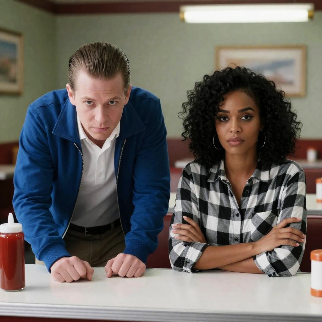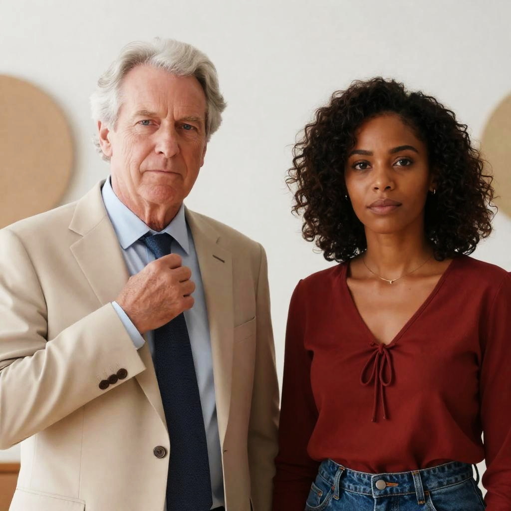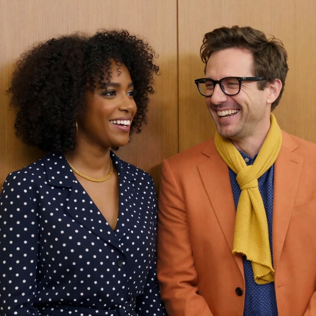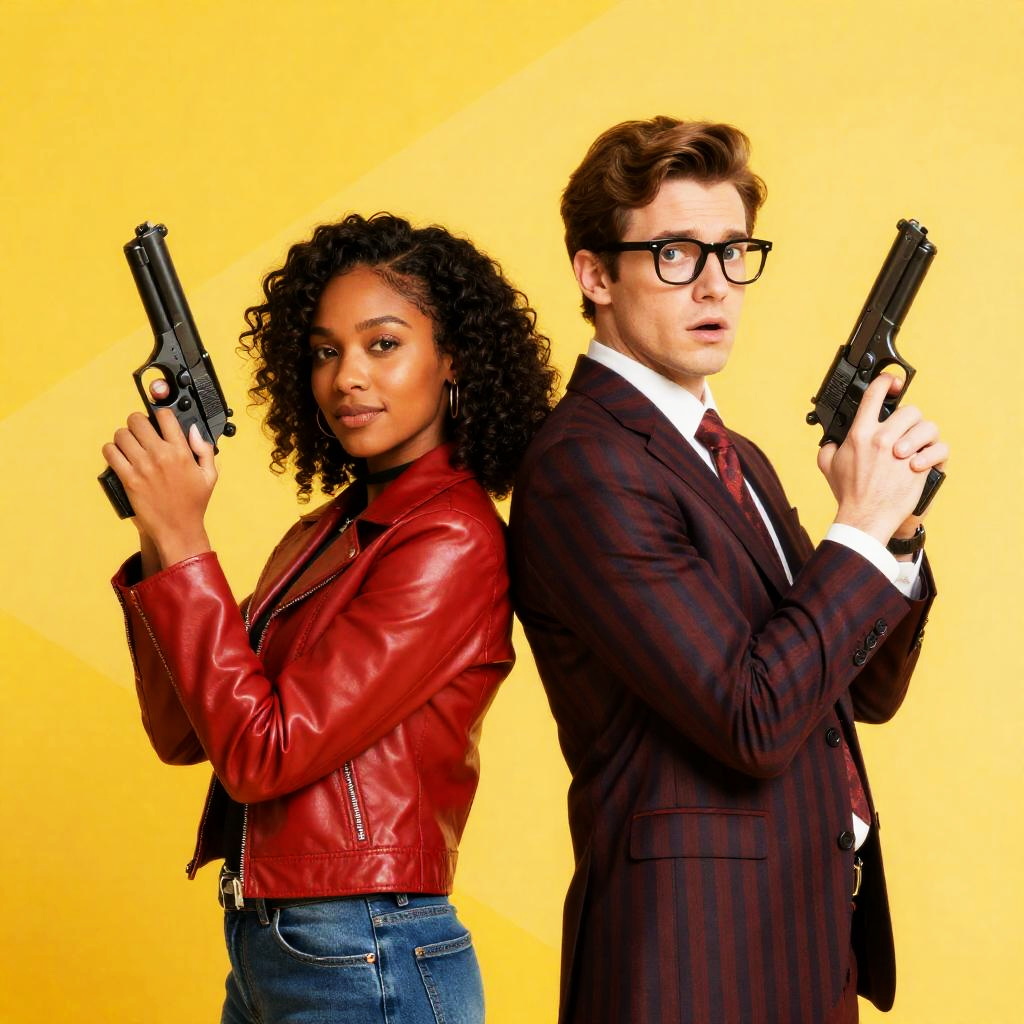 Photograph of two people with guns, standing back-to-back. Woman with curly hair, brown skin, red leather jacket, black choker, holding gun in left hand. Man with brown hair, glasses, red blue striped suit, red patterned tie, holding gun in right hand. Bright yellow geometric background with diagonal lines. Woman's expression is confident, man's expression is surprised. Both have guns raised.