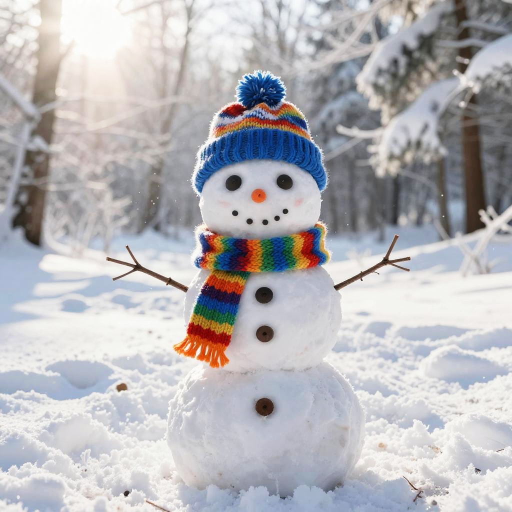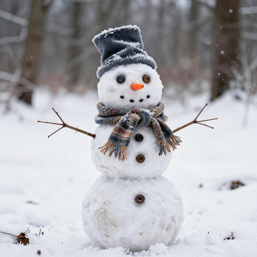Photograph of a charming snowman with a gray knit hat and scarf, black buttons, and twig arms, standing in a sunlit snowy yard with