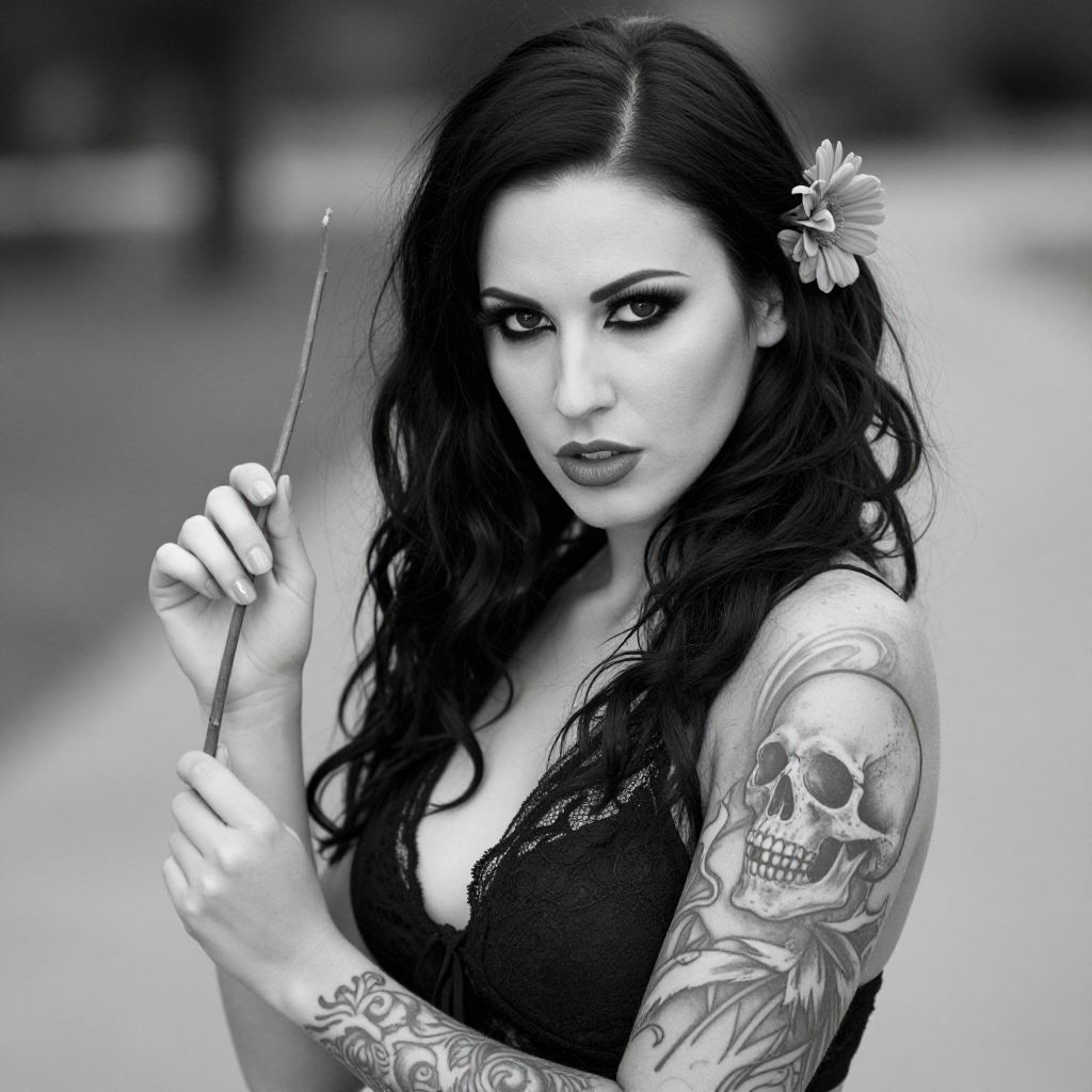 Black-and-white photo of a woman with long, wavy dark hair, wearing a black lace top. She has dramatic, dark eyeliner and lipstick, and intricate tattoos covering her right arm, featuring a detailed skull. She holds a thin stick in her right hand, with a flower in her hair. The background is blurred, suggesting an outdoor setting. Her expression is intense and mysterious.