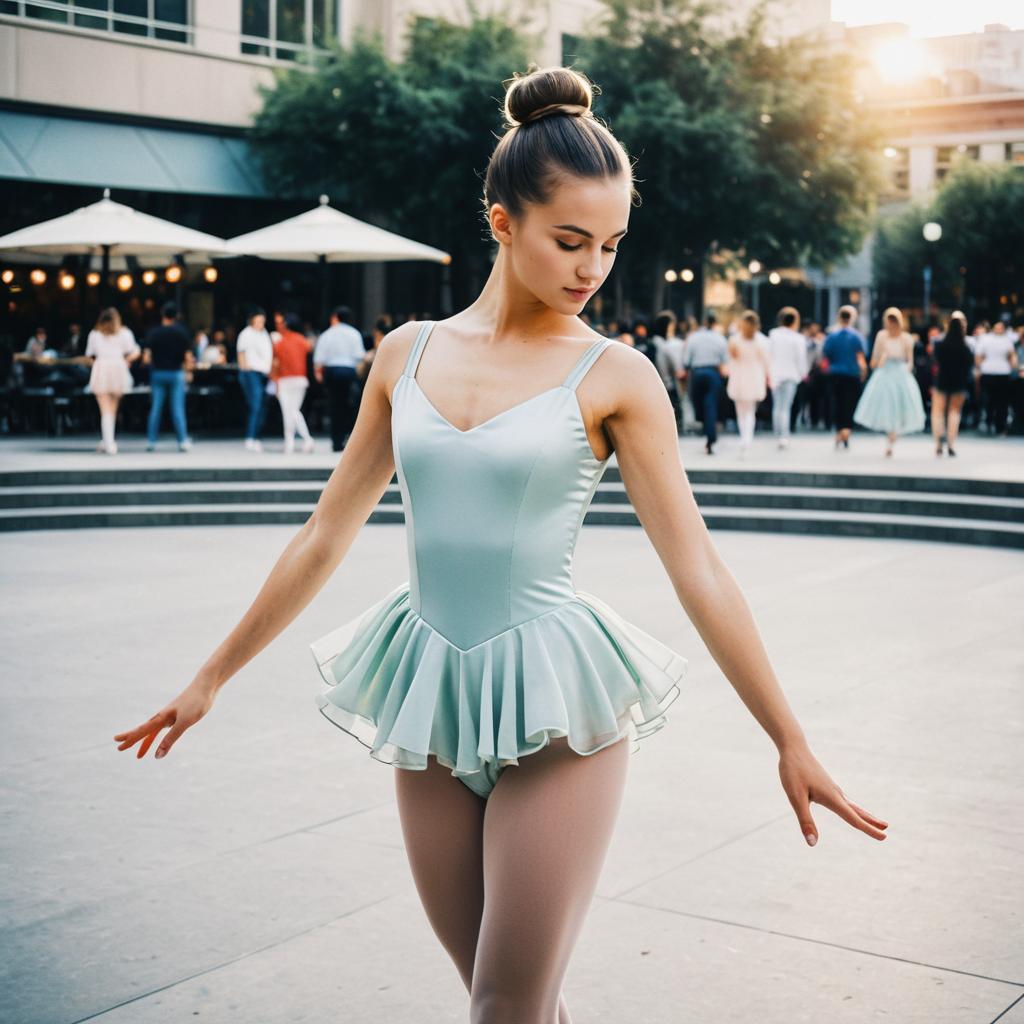 Ballerina Bun hairstyle on teenage female dancer, wearing flowing satin leotard with chiffon overlay, in outdoor urban plaza, captured in fashion editorial style with soft glow.