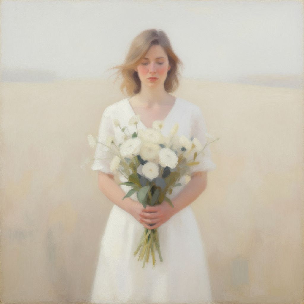 Oil painting style image of a young woman with shoulder-length hair standing in a neutral beige field. She is wearing a simple white dress with short sleeves and holding a large bouquet of white flowers with green foliage. The artwork features soft, muted tones with a serene and peaceful atmosphere.