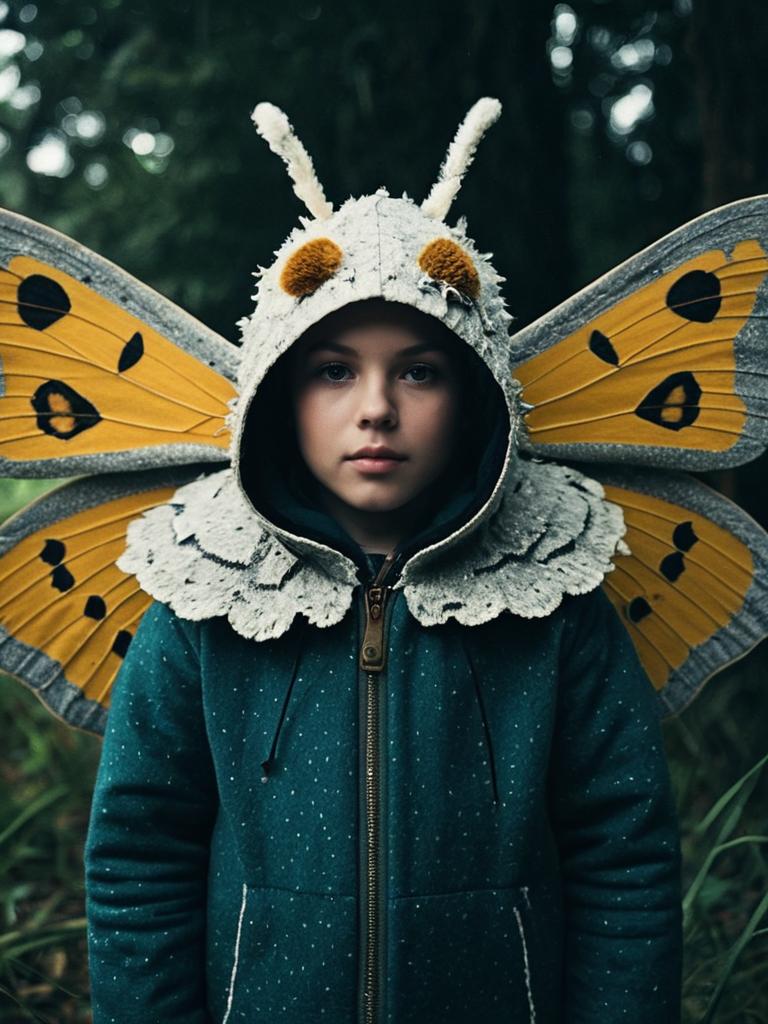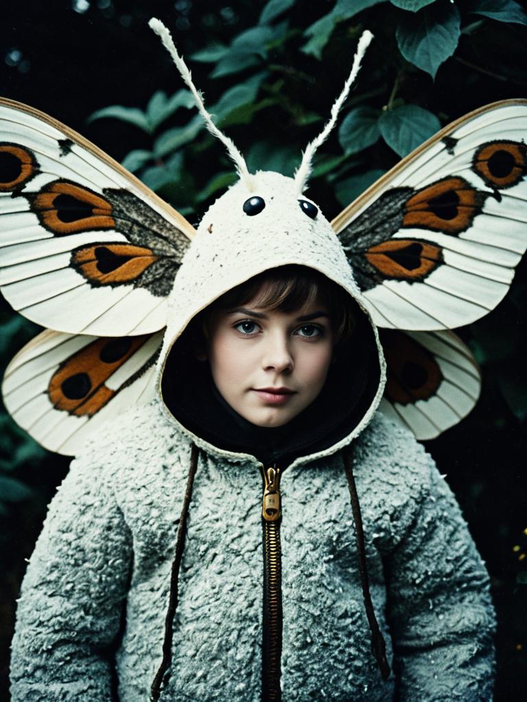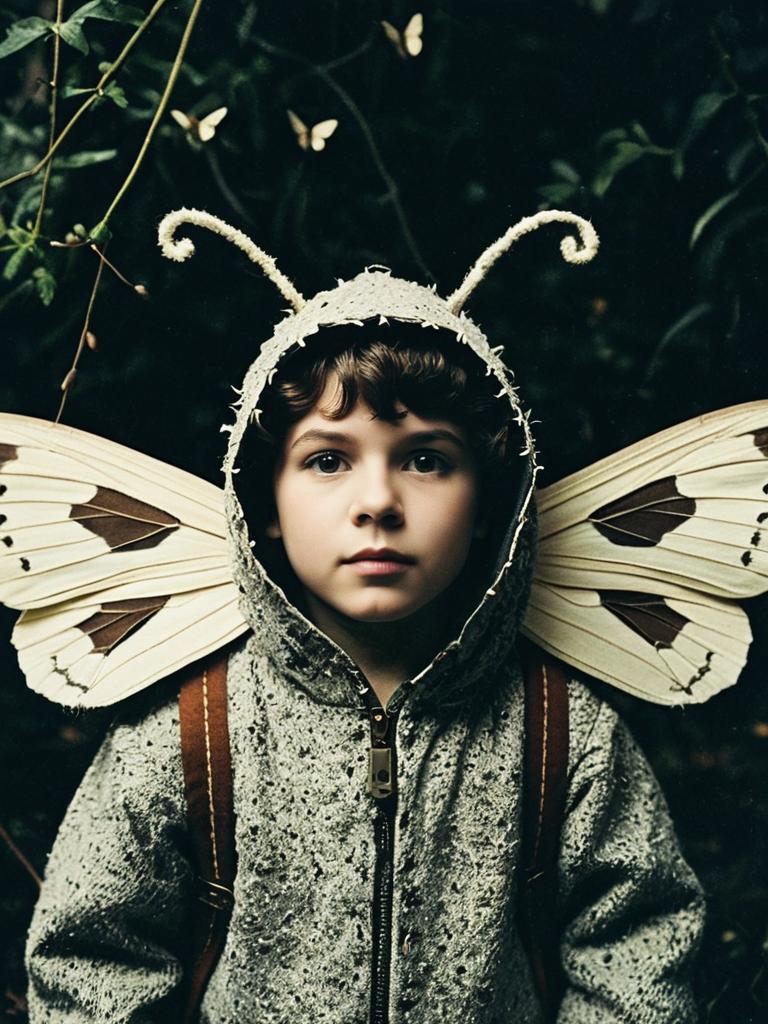 Boy in Moth Costume, cinematic realism, magical whimsical portrait