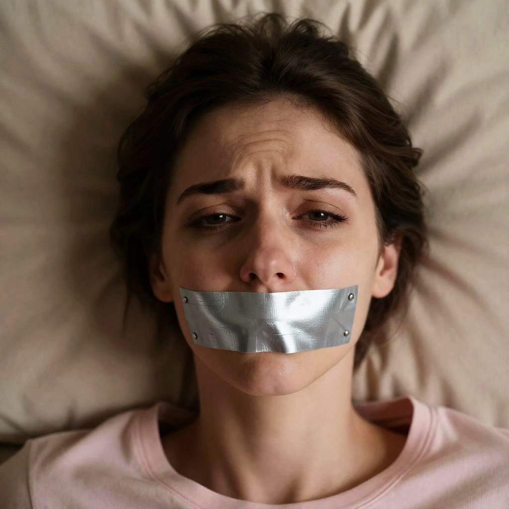 Photograph of a woman with long, curly black hair, arms raised and bound above her head, wearing a white sleeveless top. Dark, dimly lit background. Her expression is tense and slightly fearful. Black straps bind her wrists.