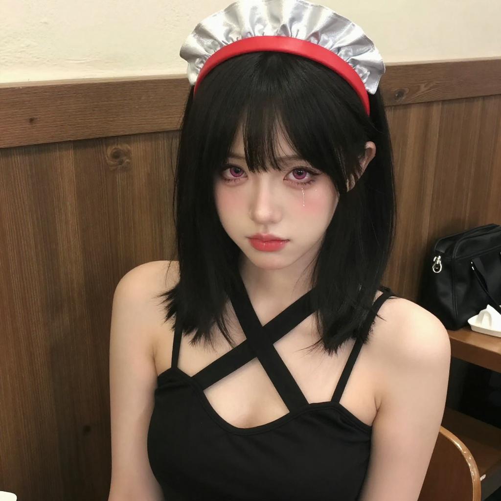 Photograph of a young woman with pale skin and black, shoulder-length hair wearing a silver and red maid headband. She has pink, slightly teary eyes and red lipstick. She wears a black, strappy, revealing top with a keyhole cutout. She is seated against a wooden-paneled wall, with a black bag and white object partially visible in the background.