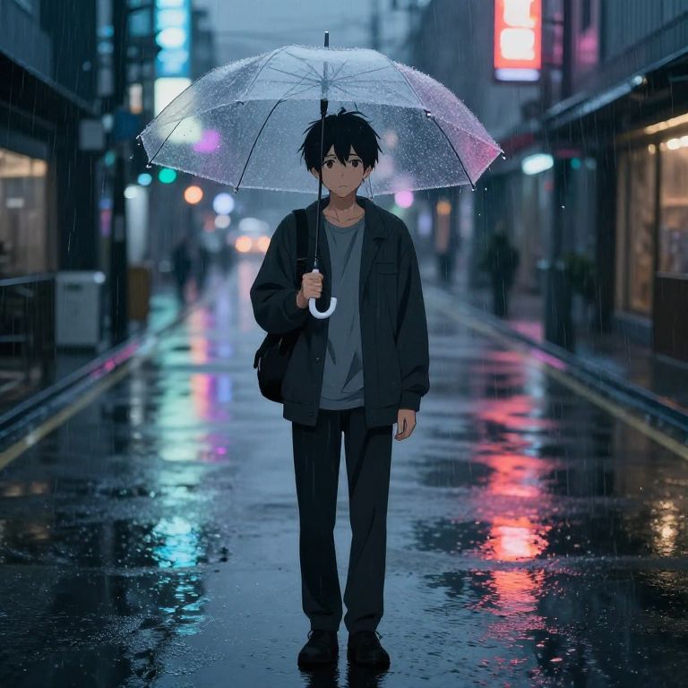 Anime boy standing on a rainy street with glistening wet pavement, holding a transparent umbrella, reflections of colorful city lights all around, melancholic mood, detailed raindrops and atmospheric anime style.