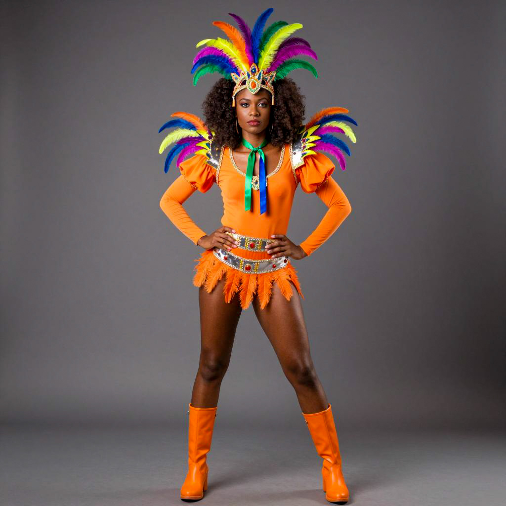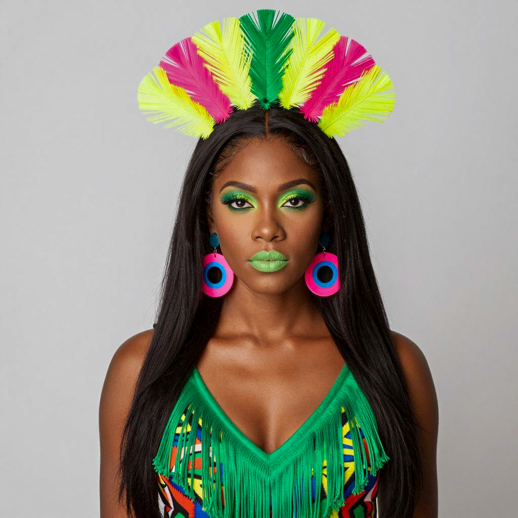 Photograph of a dark-skinned woman with long black hair, wearing a vibrant, colorful headdress with neon green, pink, and yellow elements. She has striking green eye makeup, full lips, and large circular earrings with neon pink and blue centers. Her outfit features green fringe and colorful patterns. She looks directly at the camera with a neutral expression. Background is plain white. Upper body is visible.