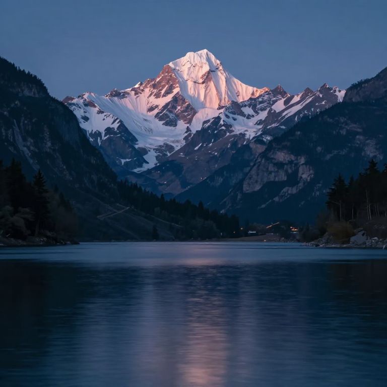 Photograph of a majestic snow-capped mountain peak illuminated by pink and white light at dusk, set against a clear blue sky. The mountain, surrounded by dark, forested valleys, reflects in a calm, dark blue lake in the foreground. The water's surface is smooth, mirroring the mountain's colors. The scene captures the serene beauty of nature with contrasting dark and light elements, and the vivid colors highlight the mountain's dramatic, rugged texture.