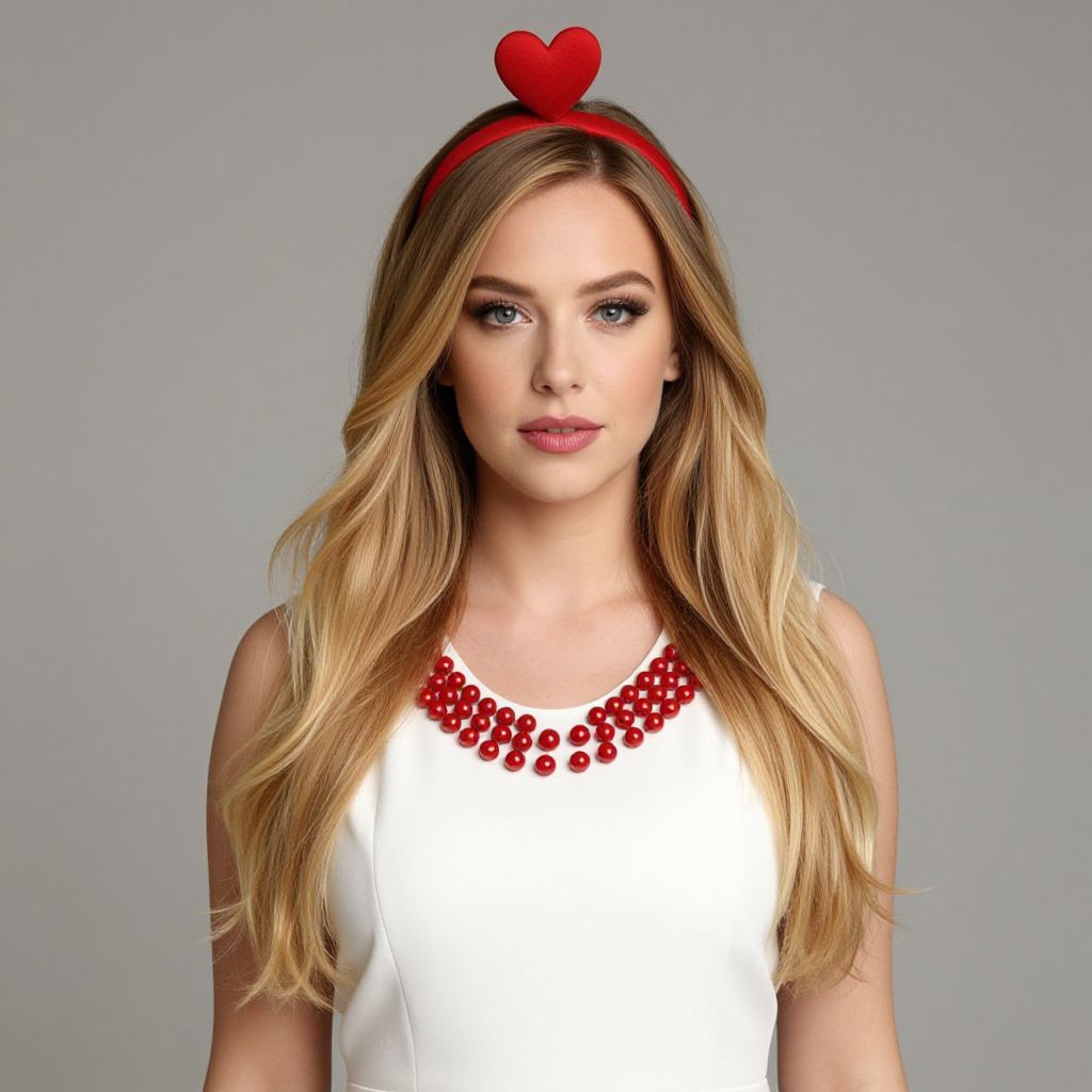 A woman with long blonde hair is wearing a white dress with red beads on the neckline. The woman has a red headband with a heart on it.