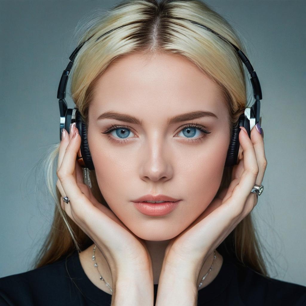 1girl, solo, realistic, jewelry, ring, black hair, long hair, looking at viewer, blue eyes, photorealistic, lips, hand on own face, head tilt, shirt, earphones, freckles, makeup, portrait, black shirt, multicolored hair, brown hair, head rest, hand on own cheek, earrings, blonde hair