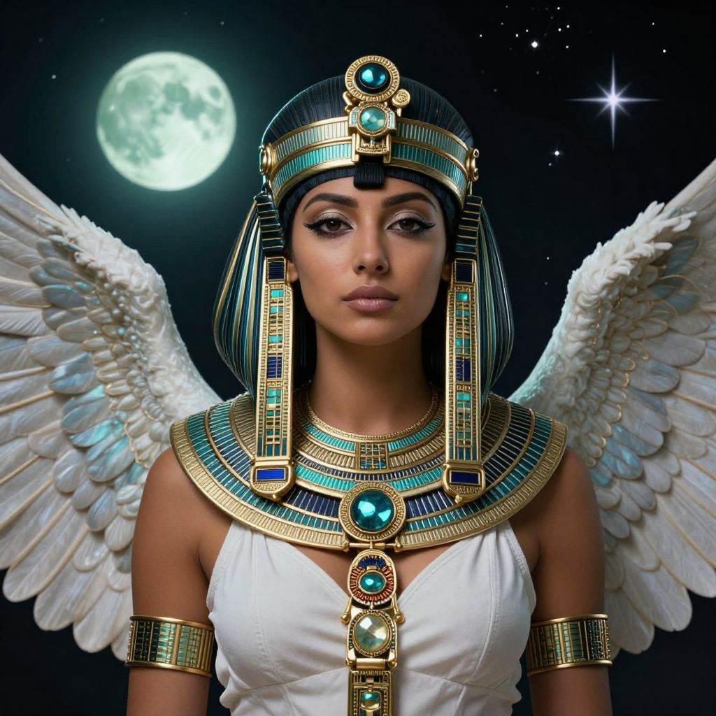 Digital artwork of a serene, dark-skinned, winged Egyptian goddess with turquoise and gold jewelry, white dress, and starry night background.