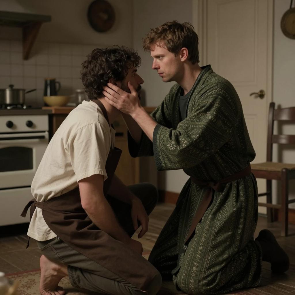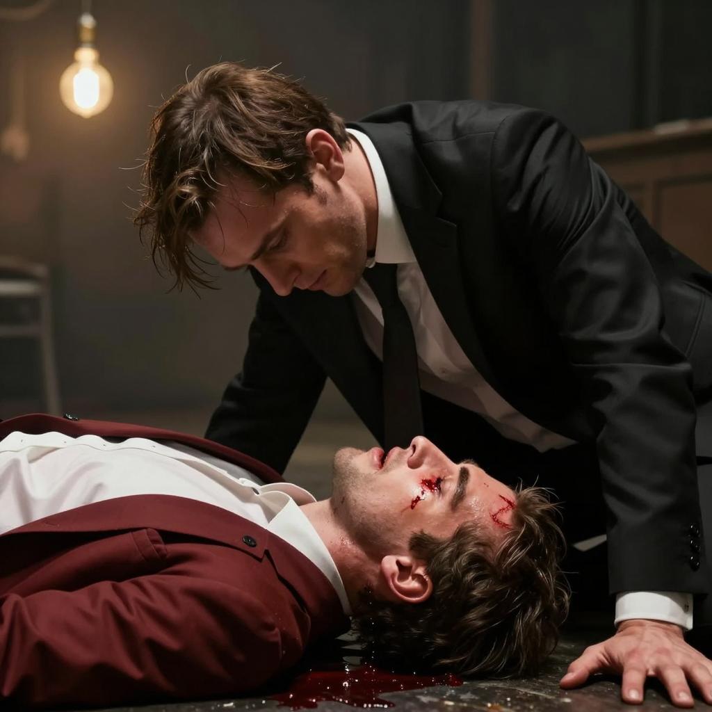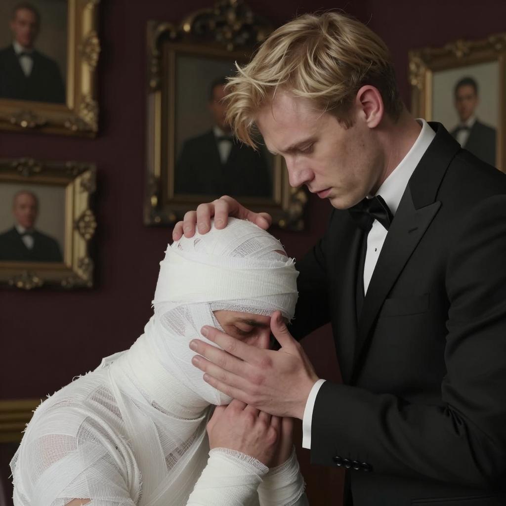 Two men, one with blond hair and black suit, tending to the other's head, which is bandaged. The bandaged man looks pained, with hands on his face. Dark, ornate background with framed pictures. Intimate, concerned interaction.
