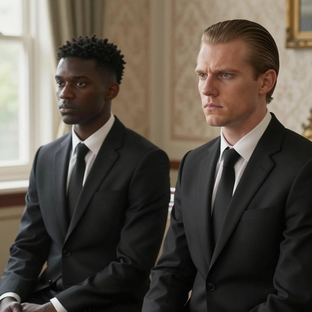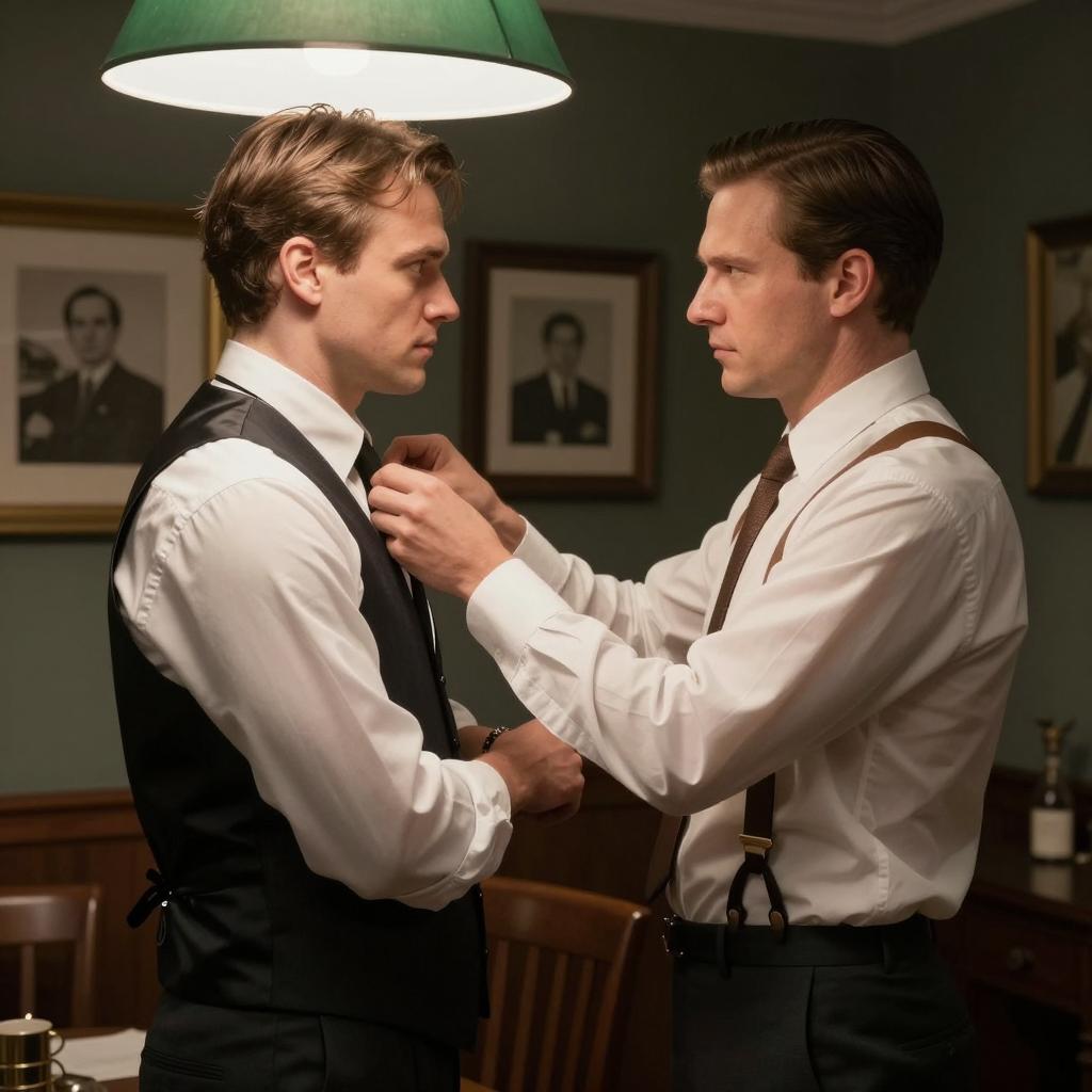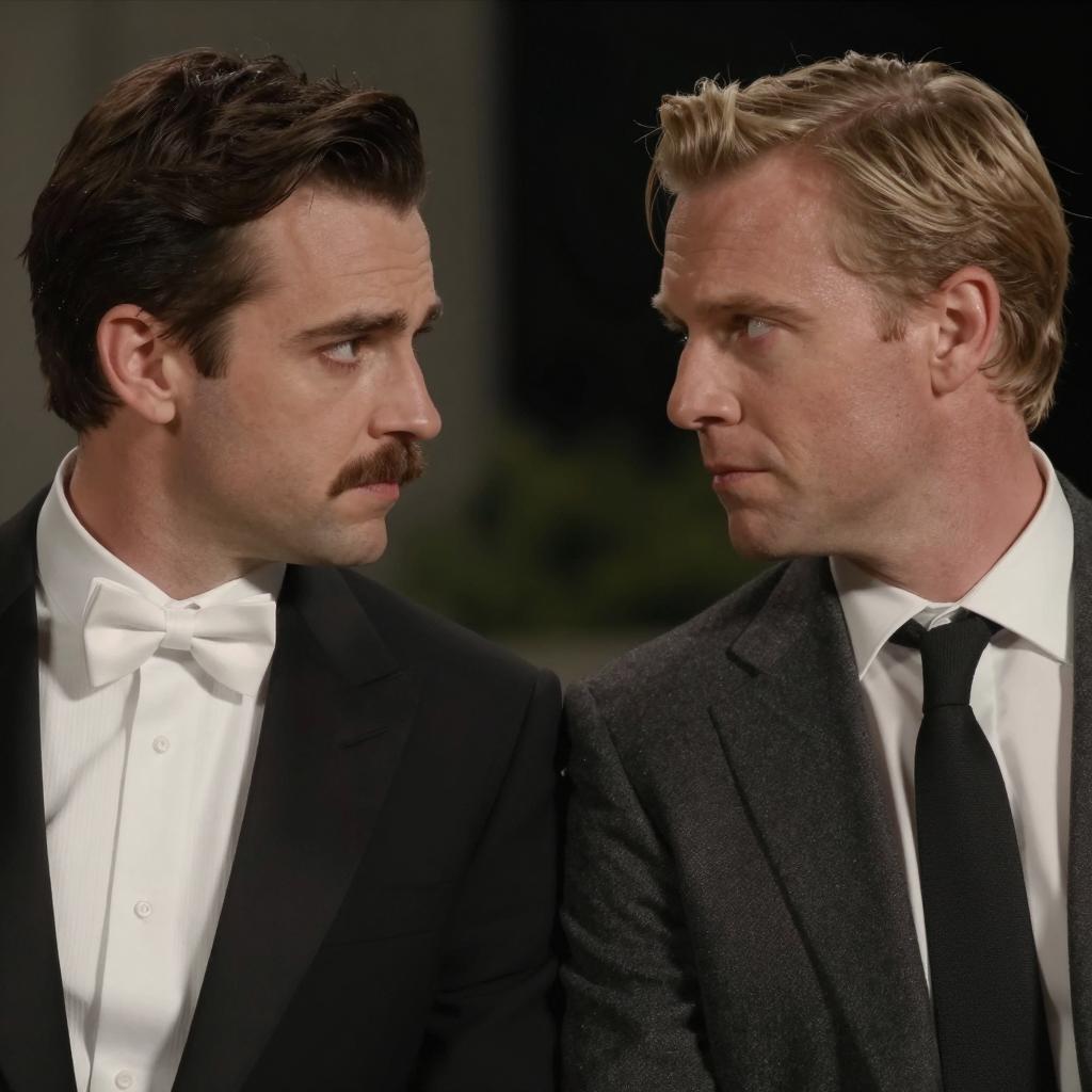 Two men, one with blond hair and black suit, tending to the other's head, which is bandaged. The bandaged man looks pained, with hands on his face. Dark, ornate background with framed pictures. Intimate, concerned interaction.