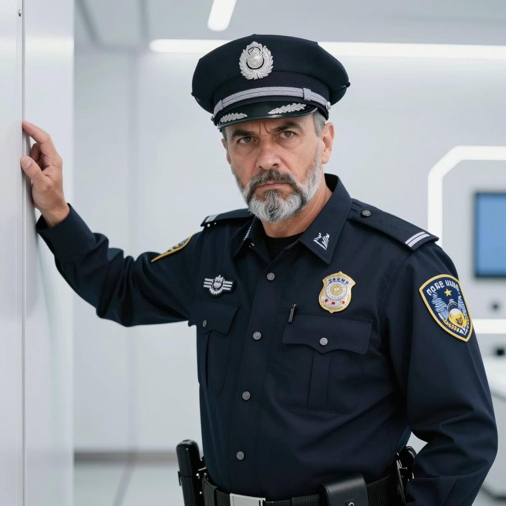 Middle-aged man with gray beard in dark blue police uniform, cap with emblem, black shirt, badge on left chest. Intense expression, standing indoors, white futuristic background with geometric lighting and metal panels. Left hand on panel.