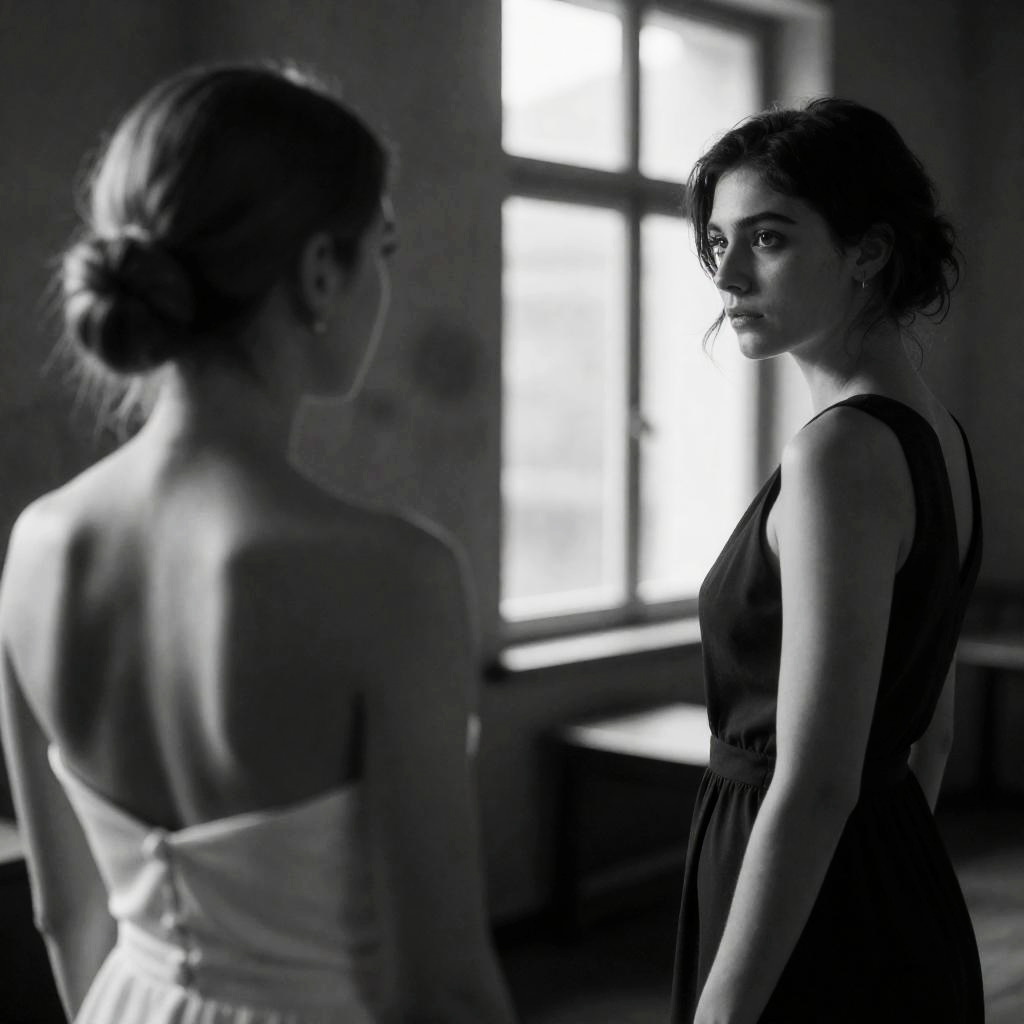 Slim blonde woman with hair styled in a bun, facing away from the camera, holding red fabric around her waist. In the dimly lit indoor background, a man wearing a blue shirt and black skirt stands near a stone pillar. Another woman dressed in yellow and red traditional clothing is seated on a bench. The scene features muted lighting and a stone architectural element.