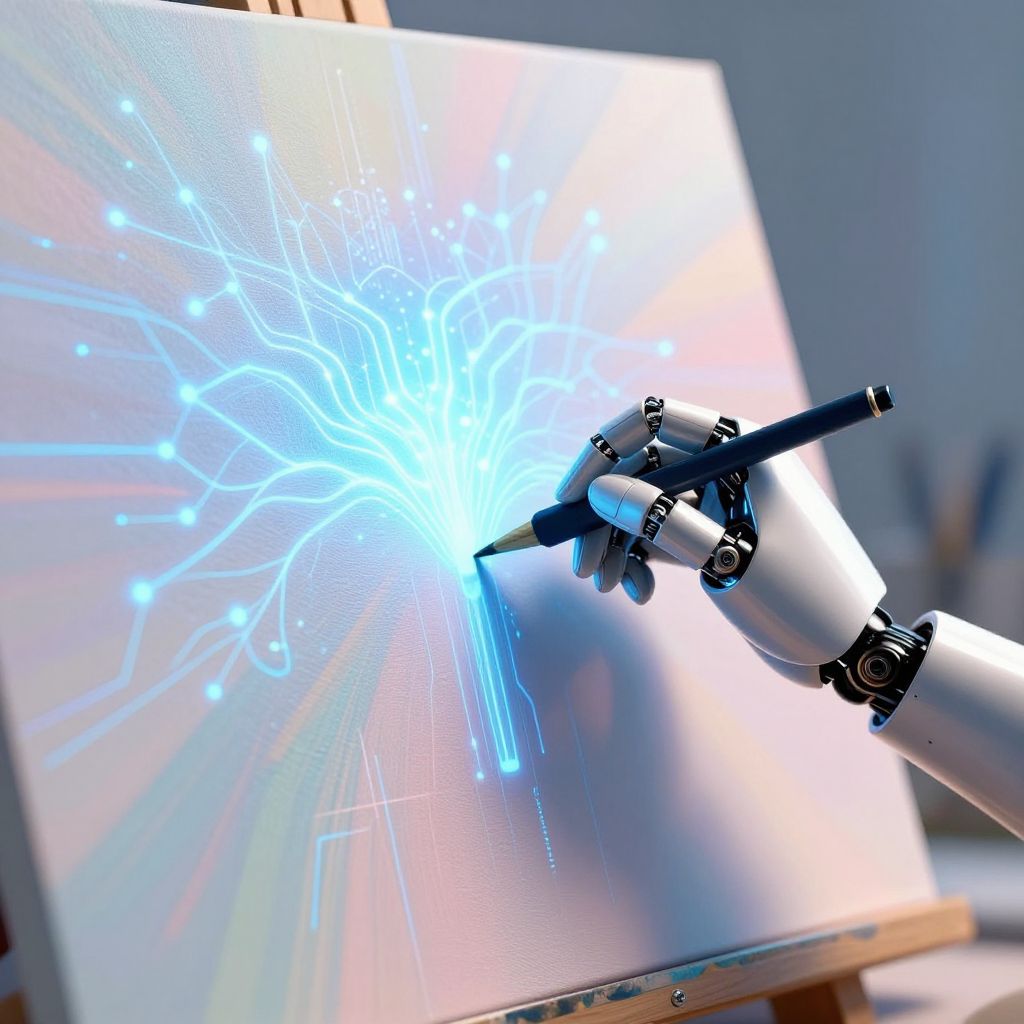 Openart.ia visualization of artificial intelligence creating art, robotic hands painting on a digital canvas, glowing neural networks and data streams in the background, soft pastel colors mixed with sharp electric blues, detailed textures and futuristic ambiance