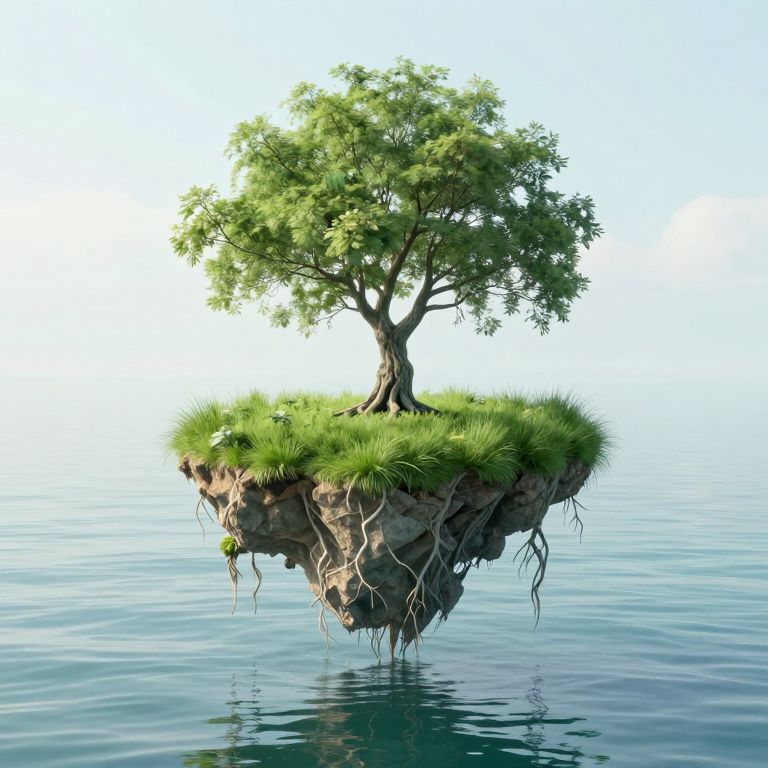 A solitary, ethereal tree stands defiantly atop a floating patch of verdant grass, its roots cascading into the tranquil waters below, defying gravity in a serene, surreal tableau.