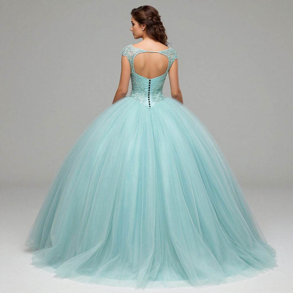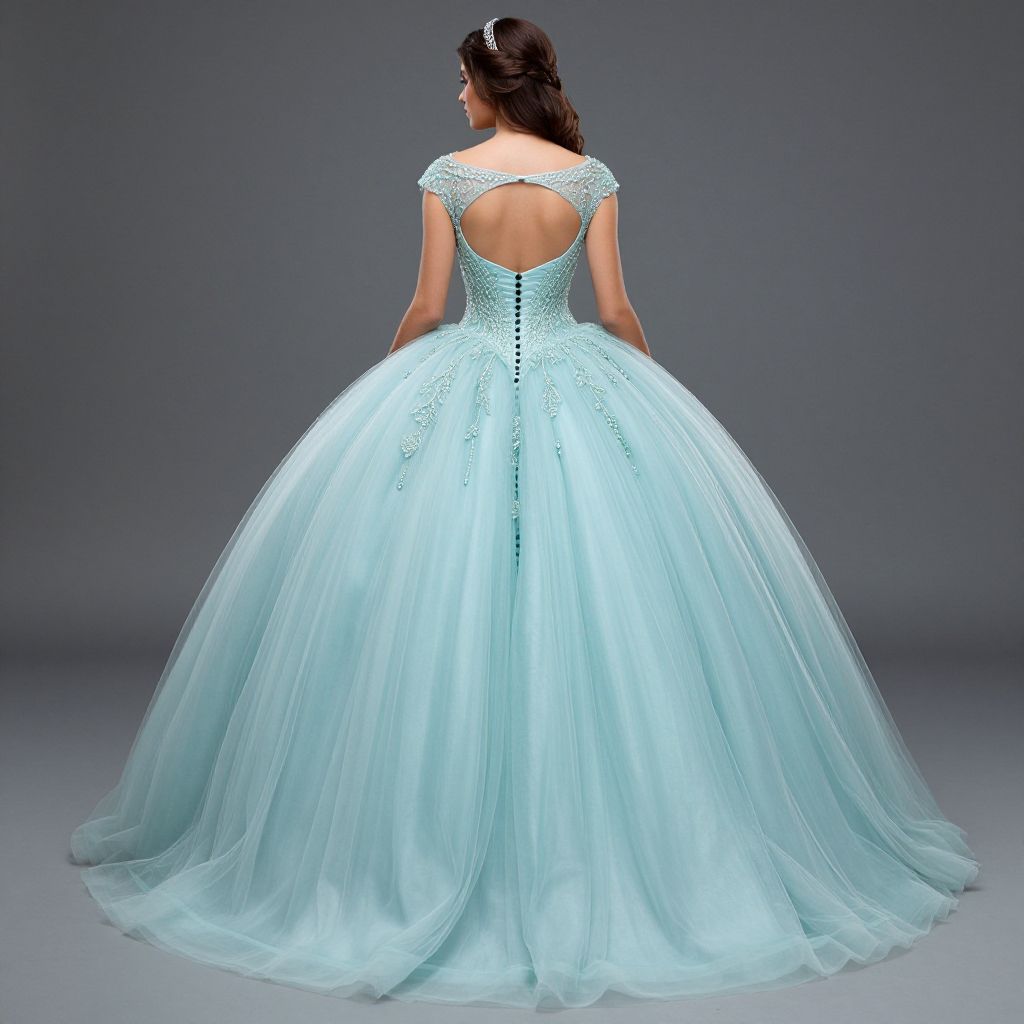 Back view of a woman showcasing a light teal quinceañera dress featuring an open back with intricate beadwork, a fitted bodice with black buttons, and a voluminous tulle skirt that gracefully cascades to the floor.