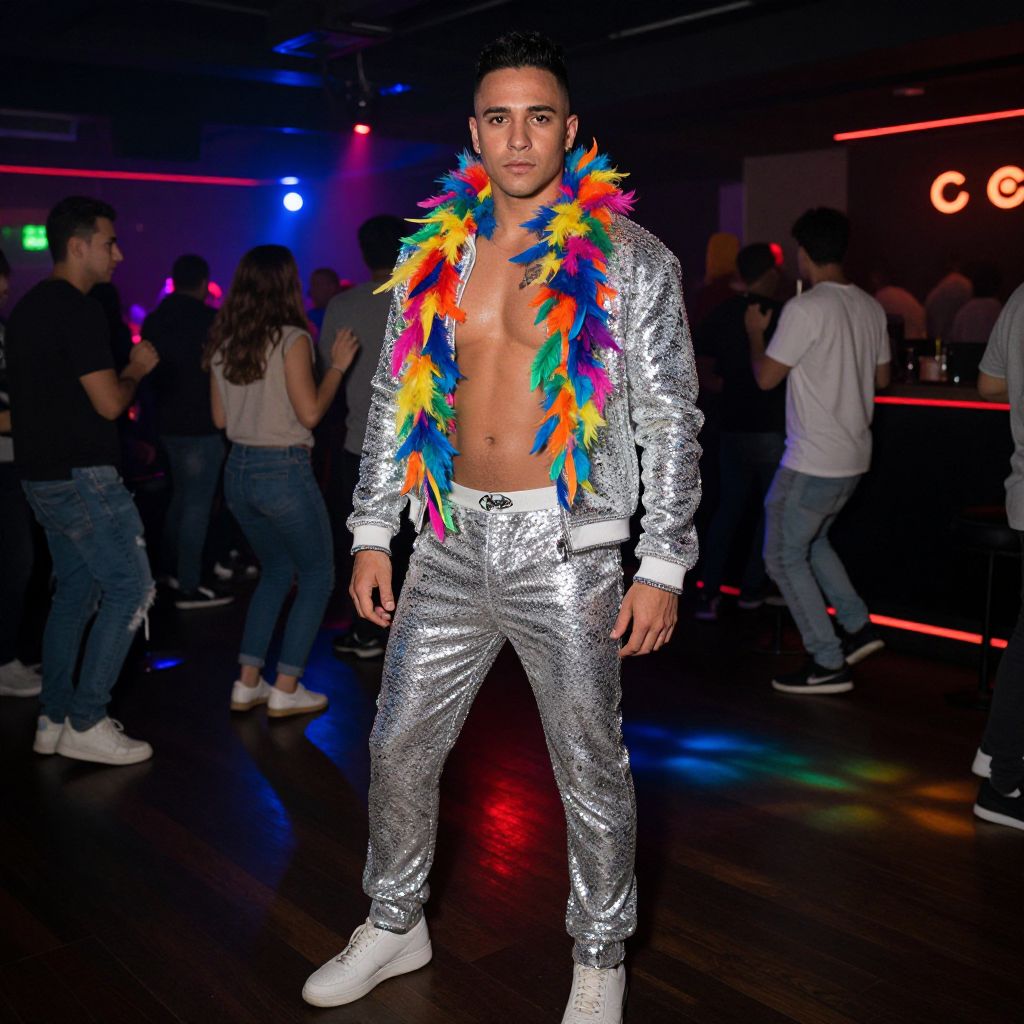 A man in a silver sequined jacket and shiny pants, wearing a colorful feather boa, standing in a dimly lit nightclub with colorful lights reflecting off the floor and people dancing in the background.