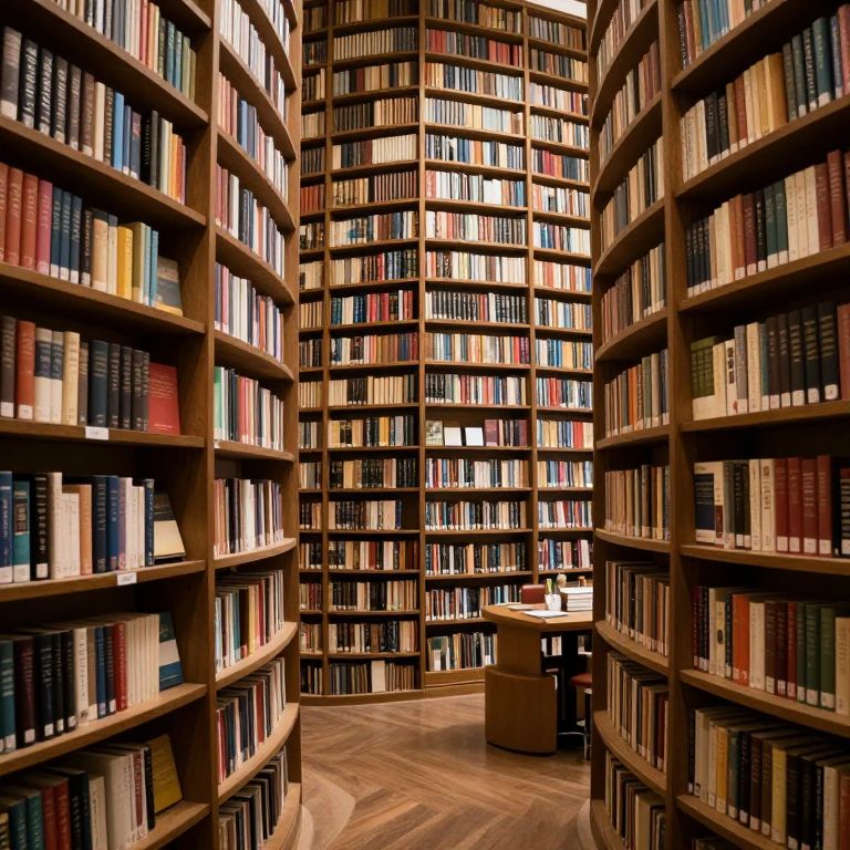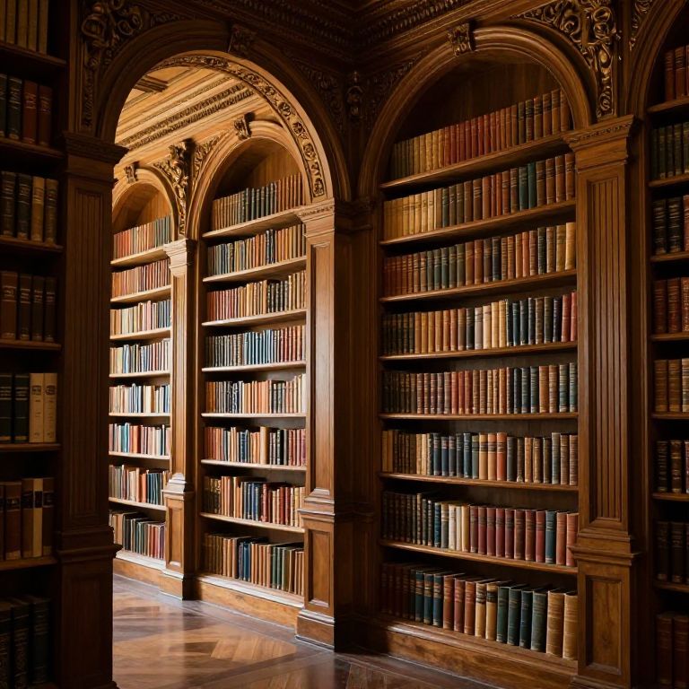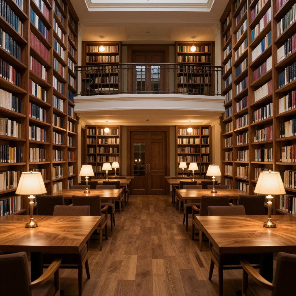 Imposing library interior bathed in warm light, featuring rows of polished wooden tables and chairs flanked by towering bookshelves, illuminated by soft table lamps and complemented by an elegant balcony above.