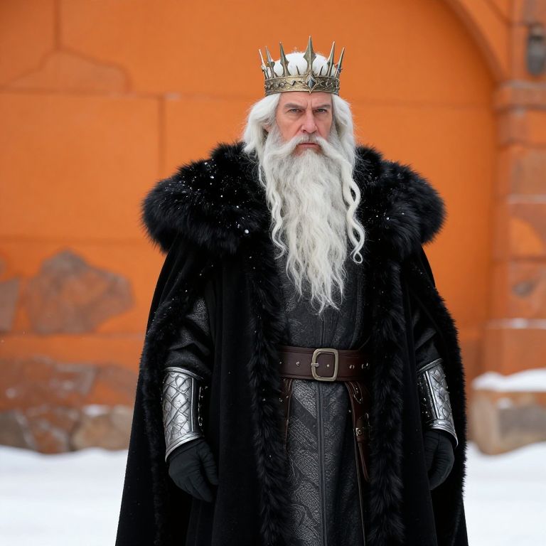 Photograph of a bearded man in dark, spiked armor throne, with a sword-adorned helmet, sitting in a dimly lit, medieval