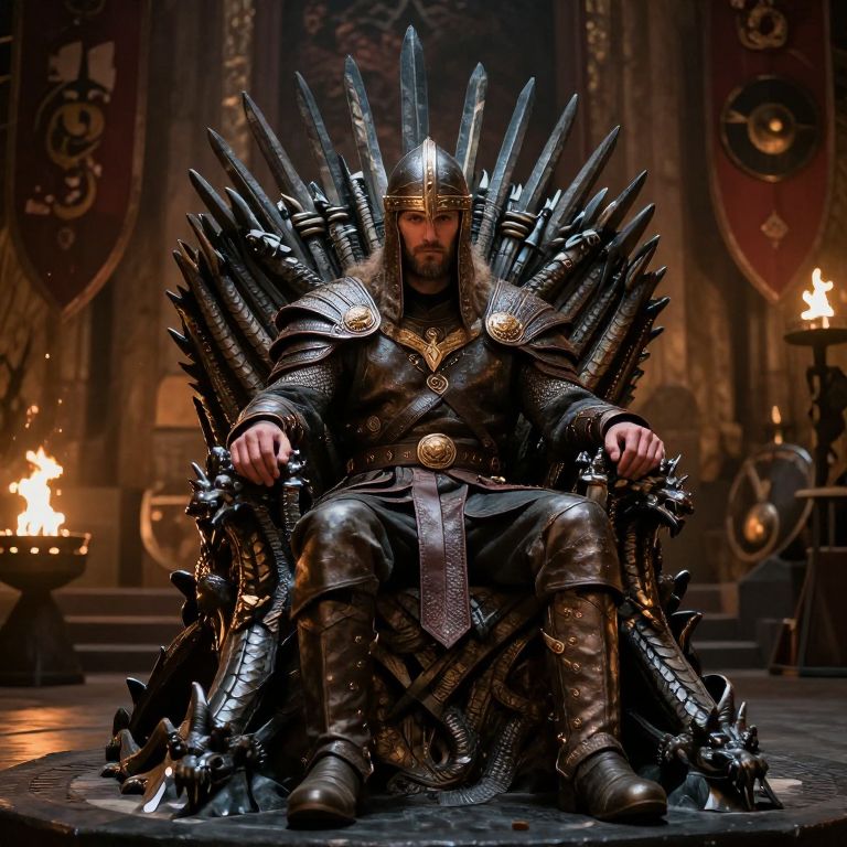 Photograph of a bearded man with a muscular build, seated on a large, spiked iron throne. He wears dark, metallic armor with gold accents, a crown with pointed tips, and a red sash. The throne has numerous sharp, black spikes surrounding the man. The background is a dimly lit, medieval-style room with stone walls, two lit torches on the left, and red banners with gold designs on the right. The man's expression is stern, and his gaze is directed forward. The overall scene evokes a dark, fantasy kingdom atmosphere.
