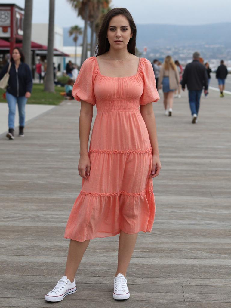 A woman, in a bohemian chic style, wearing a coral midi dress with soft gauze fabric, square neckline, and short puff sleeves, paired with white low-top sneakers and a thin gold necklace, standing at a fashionable boardwalk in Malibu, captured in a medium format film style. Sexy. Pretty face and beаutiful eyes. Big breasts