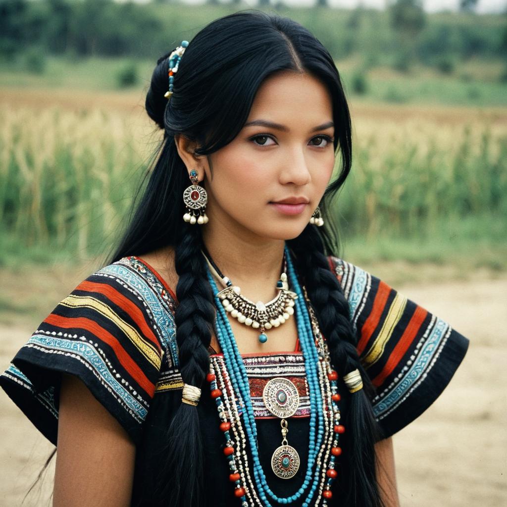 Portrait of a young Asian woman with long black hair wearing a traditional black and cream dress adorned with colorful floral embroidery. She stands in a green meadow with scattered yellow and white flowers, wearing white flowers in her hair as hair ornaments, looking directly at the camera with a calm expression.