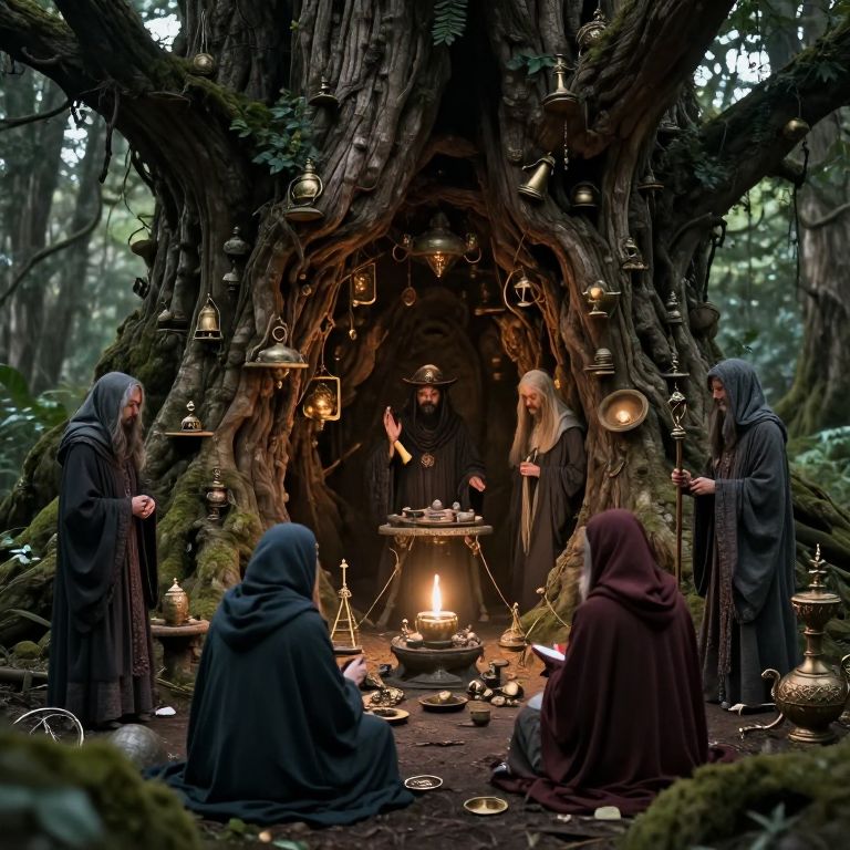 A mystical gathering unfolds within the hollowed core of an ancient tree, where cloaked figures stand guard over a hidden world of secrets, relics, and enigmatic transactions.