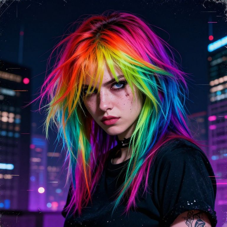 Ugly rainbow hair with uneven, patchy dye application, colors bleeding into each other awkwardly, a distressed cyberpunk city at night, gritty textures and glitch effects, character exuding confident defiance despite flawed hairstyle