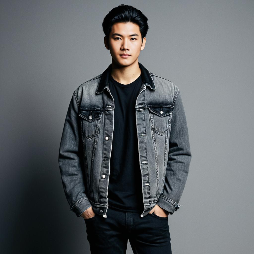 Casual work attire man dress,1boy, male focus, solo, hands in pockets, pants, shirt, realistic, jacket, black hair, collared shirt, asian, standing, brick wall