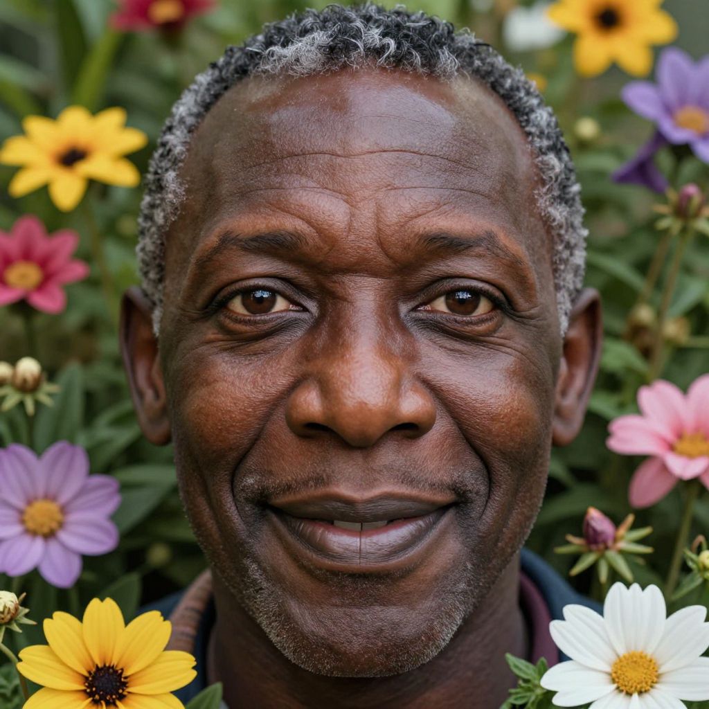 A vibrant photograph of a smiling middle-aged African-American man with short, curly, grayish-black hair and dark brown eyes. His skin is a deep, rich brown with visible wrinkles and a slight sheen. He is surrounded by a lush garden of colorful flowers, including yellow, pink, purple, and white daisies. The background is softly blurred, emphasizing the man's face and the bright floral display in the foreground. He wears a dark-colored shirt, and the image has a high contrast and vivid color palette. The man's expression is warm and friendly, with a slight smile.