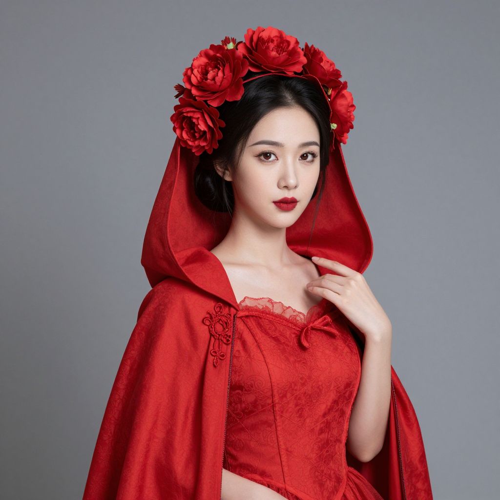 Photograph of an Asian woman with fair skin and dark hair, styled in an elegant updo adorned with a red rose crown. She wears a red lace corset with a subtle bow at the center, and a red cloak with decorative embroidery on the shoulders. Her right hand gently touches the edge of her cloak, while her left hand rests by her side. She has red lipstick and a calm, composed expression. The background is a plain, soft gray, highlighting her vibrant red attire. The image has a professional, studio-quality finish.