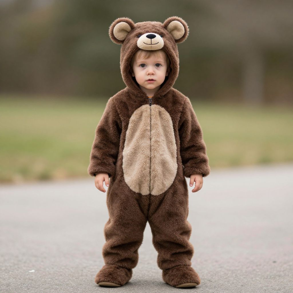 Round earth toddler costume, 1boy, solo, male focus, hood, facial hair, blurry, boots, outdoors, standing, full body, brown footwear, looking at viewer, blurry background, brown hair, smile, holding