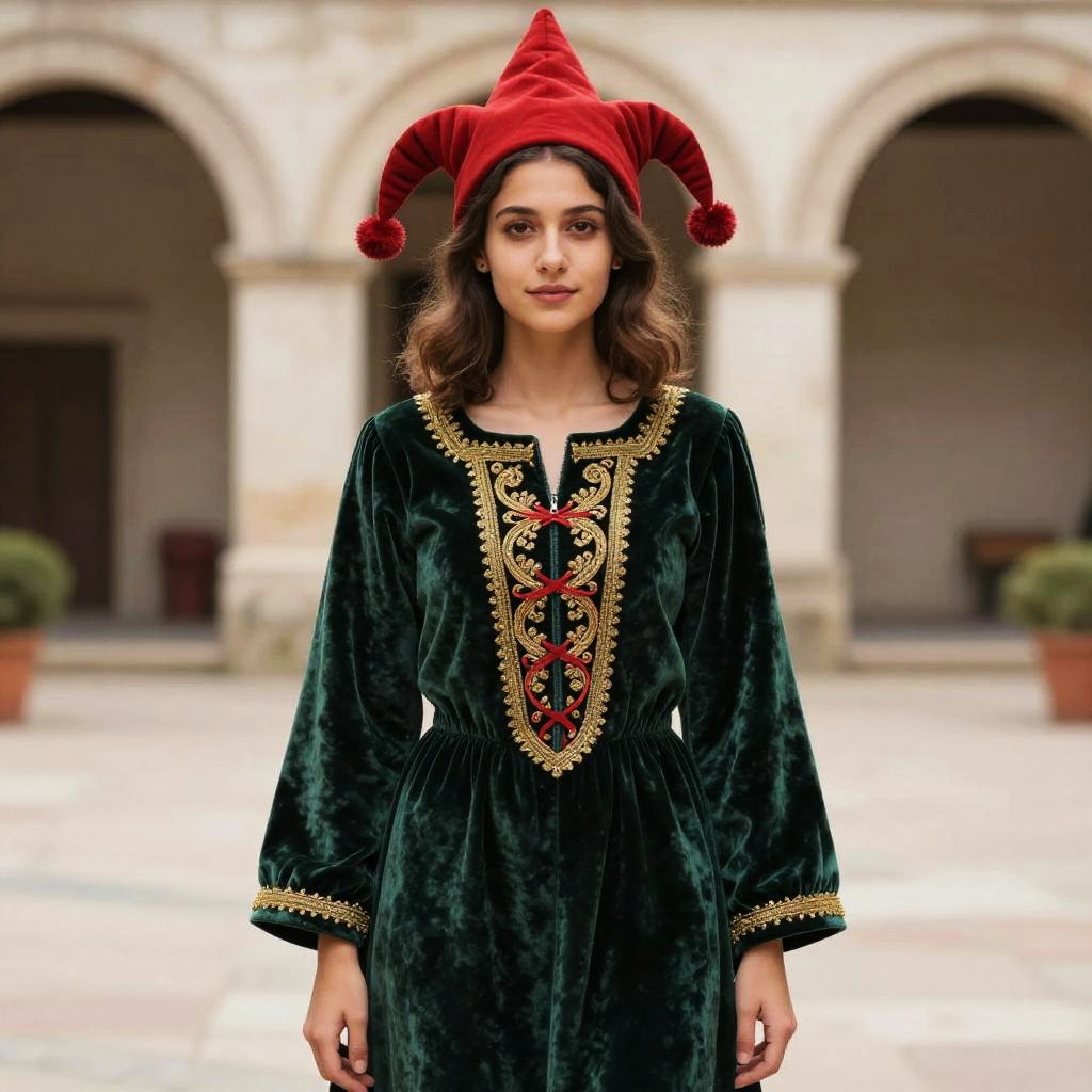 A young woman dressed in a luxurious medieval-style costume stands in a historic courtyard, featuring a deep green velvet tunic with intricate gold and red embroidery. Her distinctive red pointed hat with a pom-pom adds a whimsical touch, evoking the style of medieval jesters or noble attire.