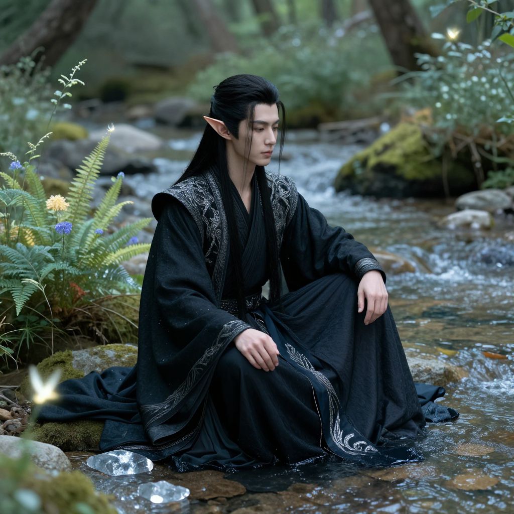Digital fantasy artwork of a young, androgynous elf with pointed ears, long black hair, and fair skin, sitting by a flowing stream in a forest. He wears a black, intricately embroidered robe that drapes over his slender frame. His gaze is serene, and his right hand rests on his knee while his left arm rests on the stream's edge. Surrounding him are ferns, moss-covered rocks, and soft, glowing fireflies. The background is a lush, green forest with blurred trees and foliage, creating a tranquil, mystical atmosphere. The water is clear, reflecting the elf and the forest.