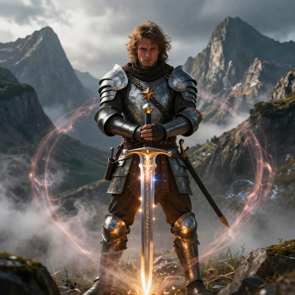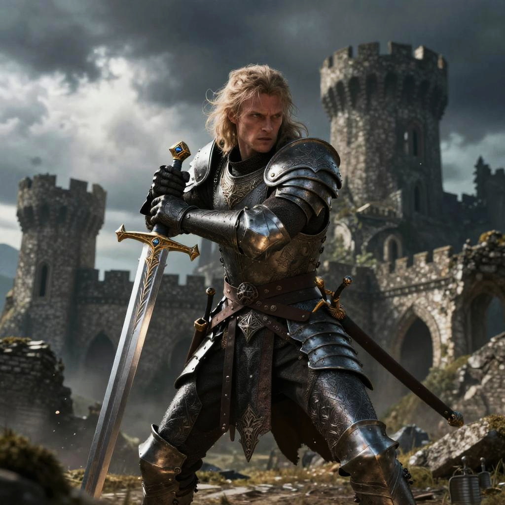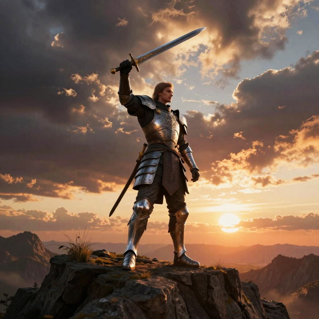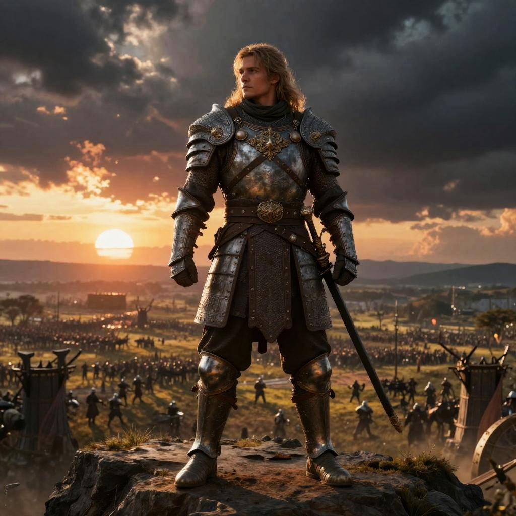 Kenney, an ancient warrior standing on a cliff overlooking a vast battlefield, armored in intricate medieval gear, with a dramatic sunset and stormy sky, cinematic lighting, epic pose, hero fantasy illustration