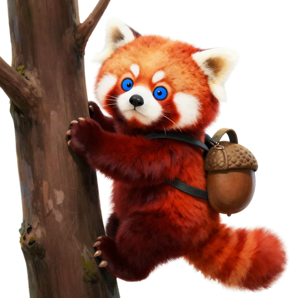 A red panda depicted in a surrealist painting, showcasing a tiny acorn backpack. Dressed in sporty attire, it displays a focused look while climbing a tree. Its bright blue eyes are wide open, illustrated as a complete character on a transparent background, embodying the playful essence of Ghibli-inspired cartoons.
