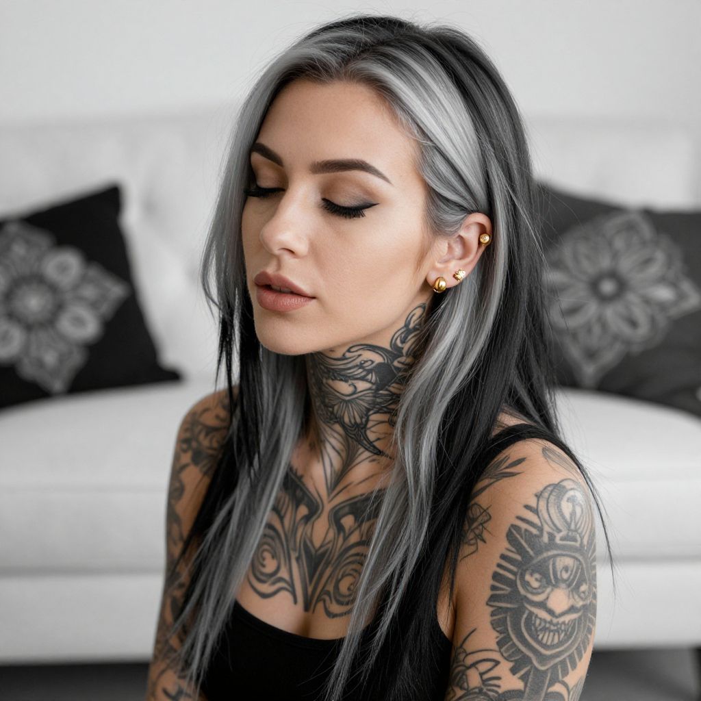 Photograph of a tattooed woman with long, silver and black streaked hair, eyes closed, and gold ear gauges. She has extensive tattoos on her neck and arm, including intricate designs. She's wearing a black top, and the background shows a blurred, white, floral-patterned couch and pillows. The image has a high-contrast, almost monochrome style.