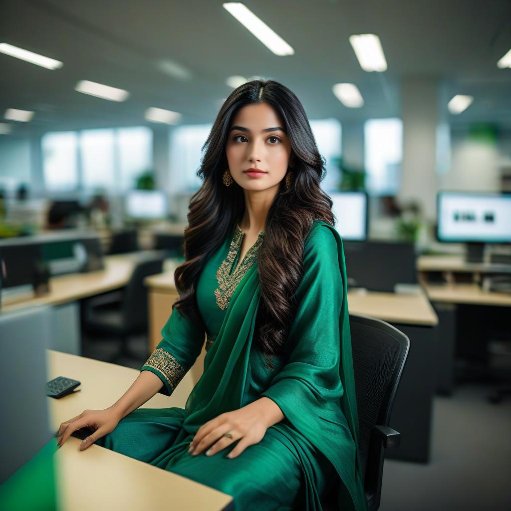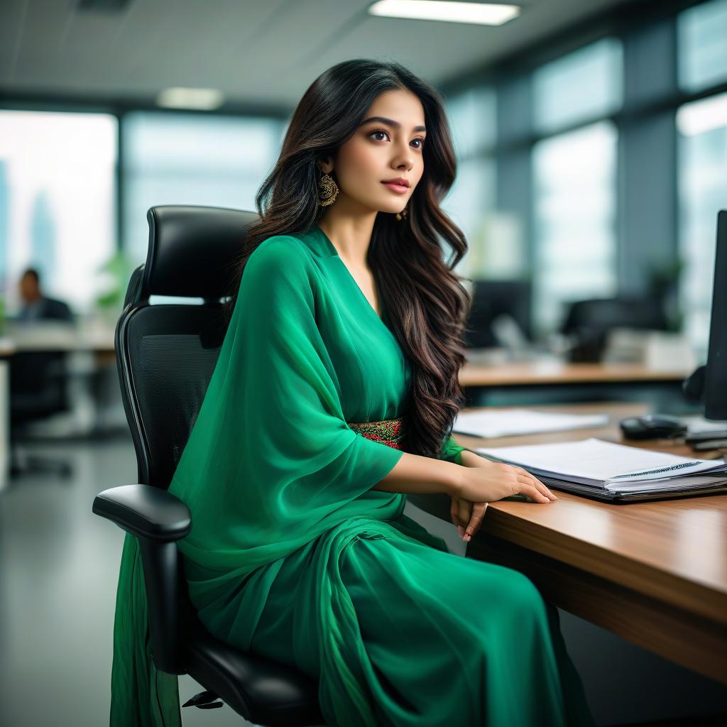 Wide-Angle Cityscapes Portrait, eye-level, digital captured using Nikon Z6 II with a 50mm f/1.4 lens in the style of environmental portrait photography, Aisha Khan, a tall and elegant Pakistani woman with long black hair, wearing a green sari and sitting on a desk chair in a busy office, light-hearted and kind expression, deep depth of field and natural lighting, slight blur, stylized 75