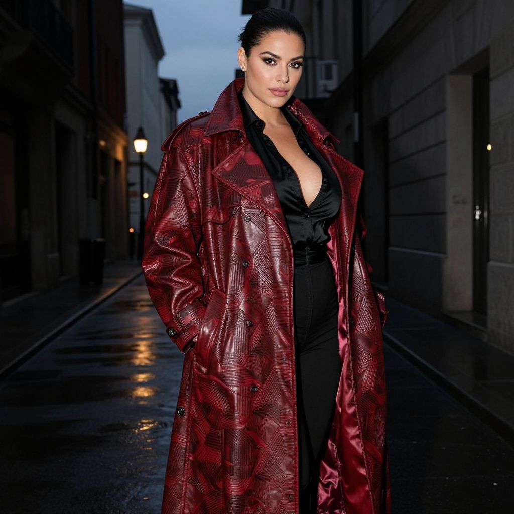 A tall, strong-bodied woman with sharp cheekbones, defined jawline, and dark brown eyes stands in a dimly lit urban alley at dusk, wearing an oversized dramatic pleather trench coat with bold geometric patterns and deep red accents. The coat drapes dramatically over her frame, highlighting its structure and texture, with the back slightly open to reveal a black silk blouse underneath. Faint city lights reflect off the wet pavement, and a few street lamps cast long shadows. The lighting emphasizes the texture of the pleather, giving it a slightly synthetic but modern, luxurious feel.. The woman has big tits and cute face