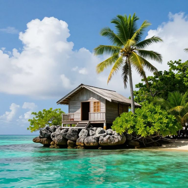 Photograph of a small, lush island with tall, green trees and reflections in calm, blue water under a bright, cloudy sky.