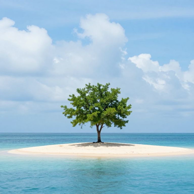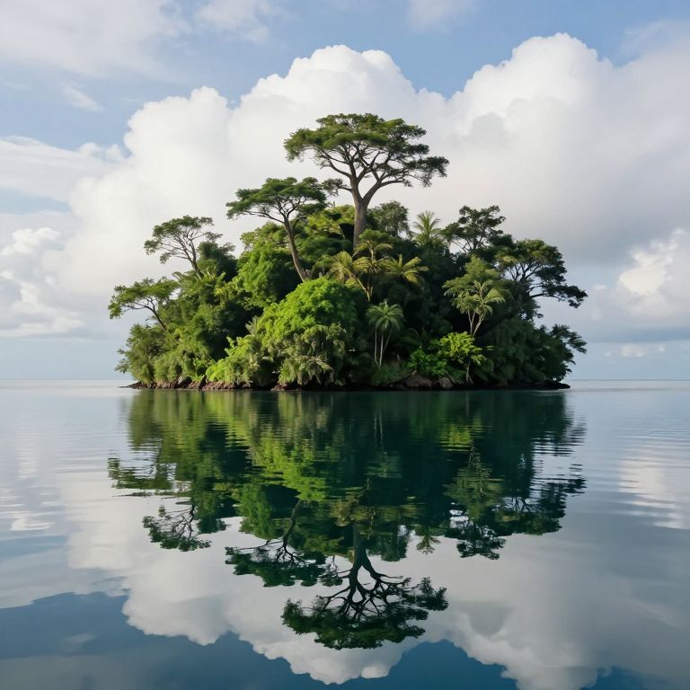 Photograph of a small, lush tropical island centered in a calm, reflective body of water. The island is densely covered with various green trees and shrubs, including tall, umbrella-like trees. The sky above is bright blue with fluffy white clouds. The water's surface mirrors the island and sky, creating a symmetrical reflection. The image has vibrant colors, with the green foliage contrasting against the blue sky and water. The overall scene is serene and picturesque.