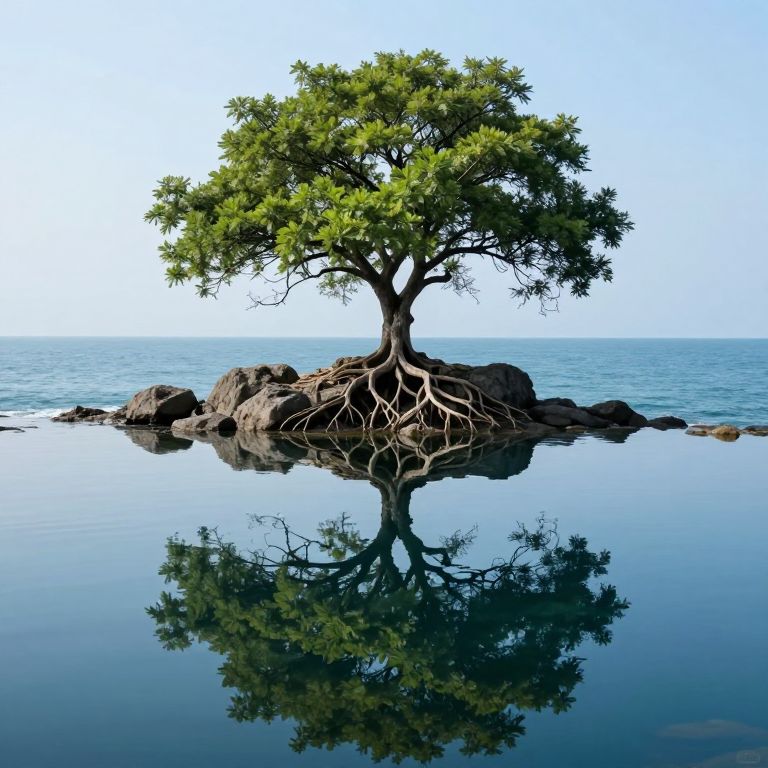 A serene island cloaked in lush greenery floats serenely above a tranquil sea, its reflection mirroring an inverted world where trees grow skyward into a boundless expanse of clouds, defying gravity and reality alike.