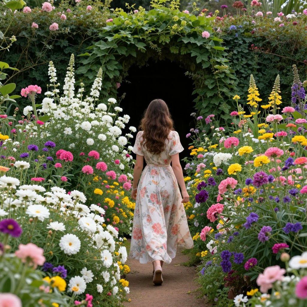 Woman in Floral Garden Pathway