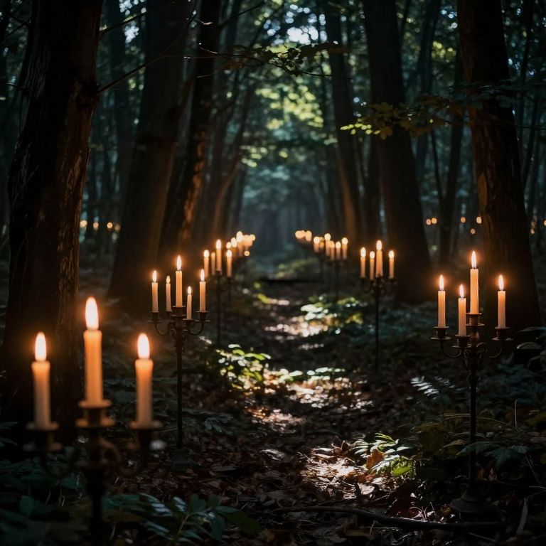 Photograph of a dark forest with a narrow, winding path illuminated by rows of glowing orange candles on metal stands. The candles are evenly spaced along both sides of the path, creating a warm, inviting glow that contrasts with the deep shadows of the dense trees. The forest floor is covered in dark, wet leaves and small puddles reflecting the candlelight. Sunlight filters through the trees in the background, adding a sense of depth and mystery to the scene. The overall atmosphere is serene and mystical, with the soft candlelight casting a gentle, ethereal glow.