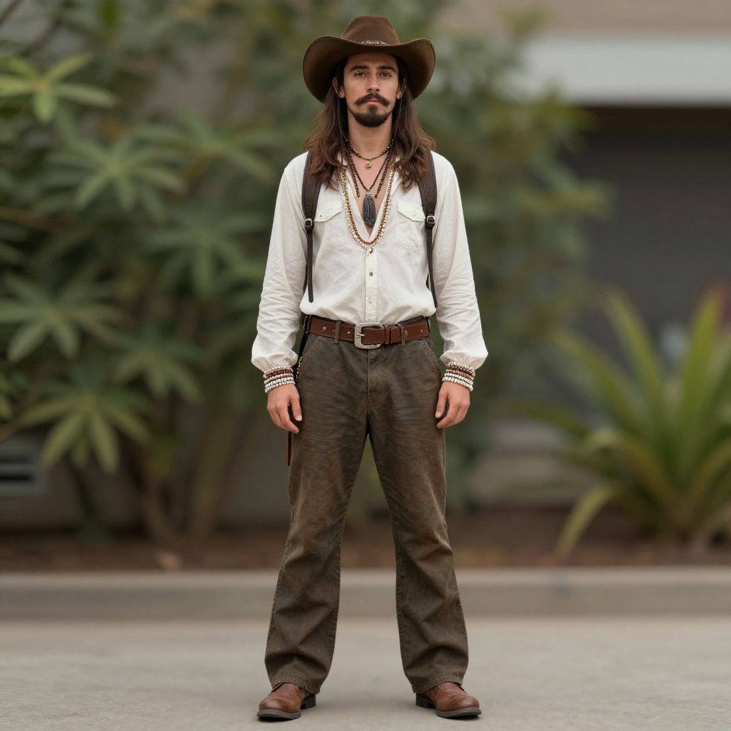 "hippie look costume, beard, hat, male focus, facial hair, long hair, cowboy hat, 1boy, outdoors, brown footwear, jewelry, blurry, blurry background, full body, standing, pants, necklace, mustache, shirt, brown hair, plant Realistic photo of casual sexy person with pretty face"