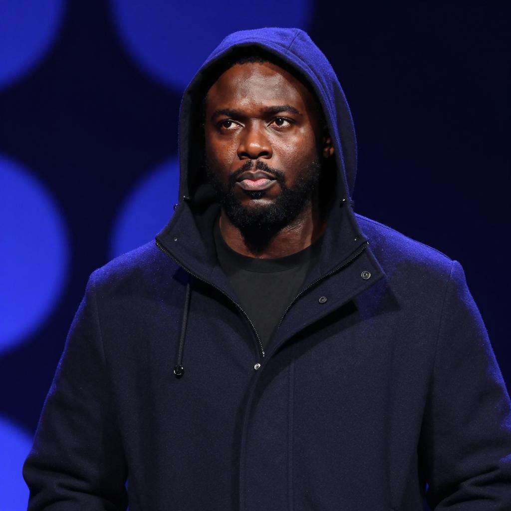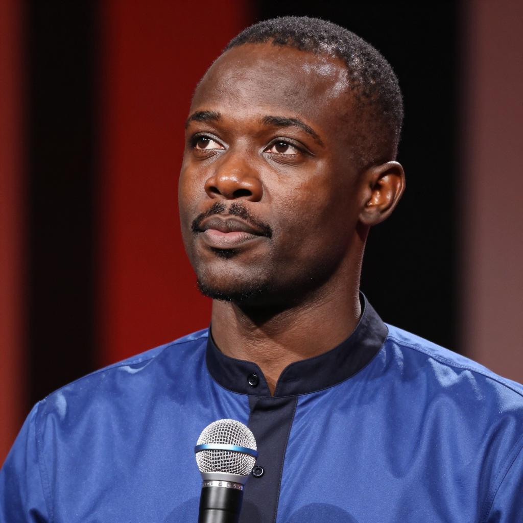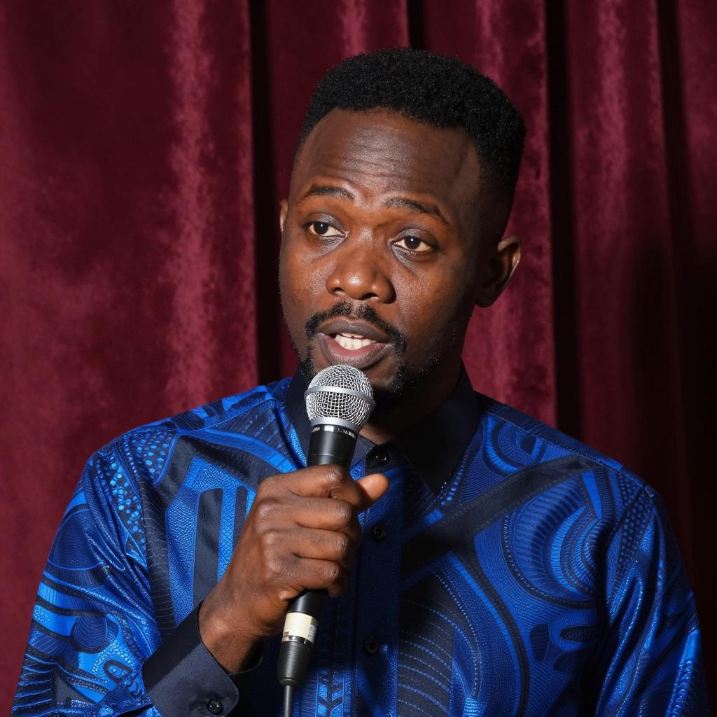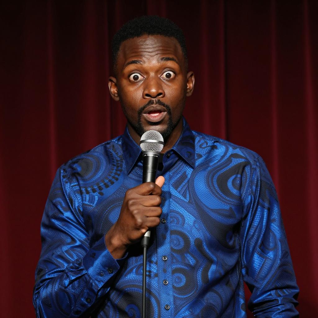 A black man with a medium-dark skin tone, short hair, and a small mustache. He wears a shiny blue shirt with a black collar. He looks upward to the left, with a neutral expression. A silver microphone is in front of him. The background has blurred red and black vertical stripes.