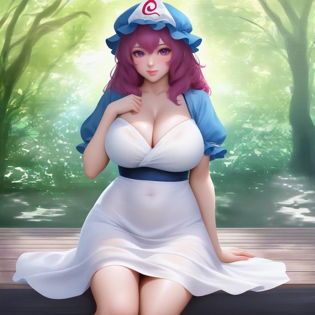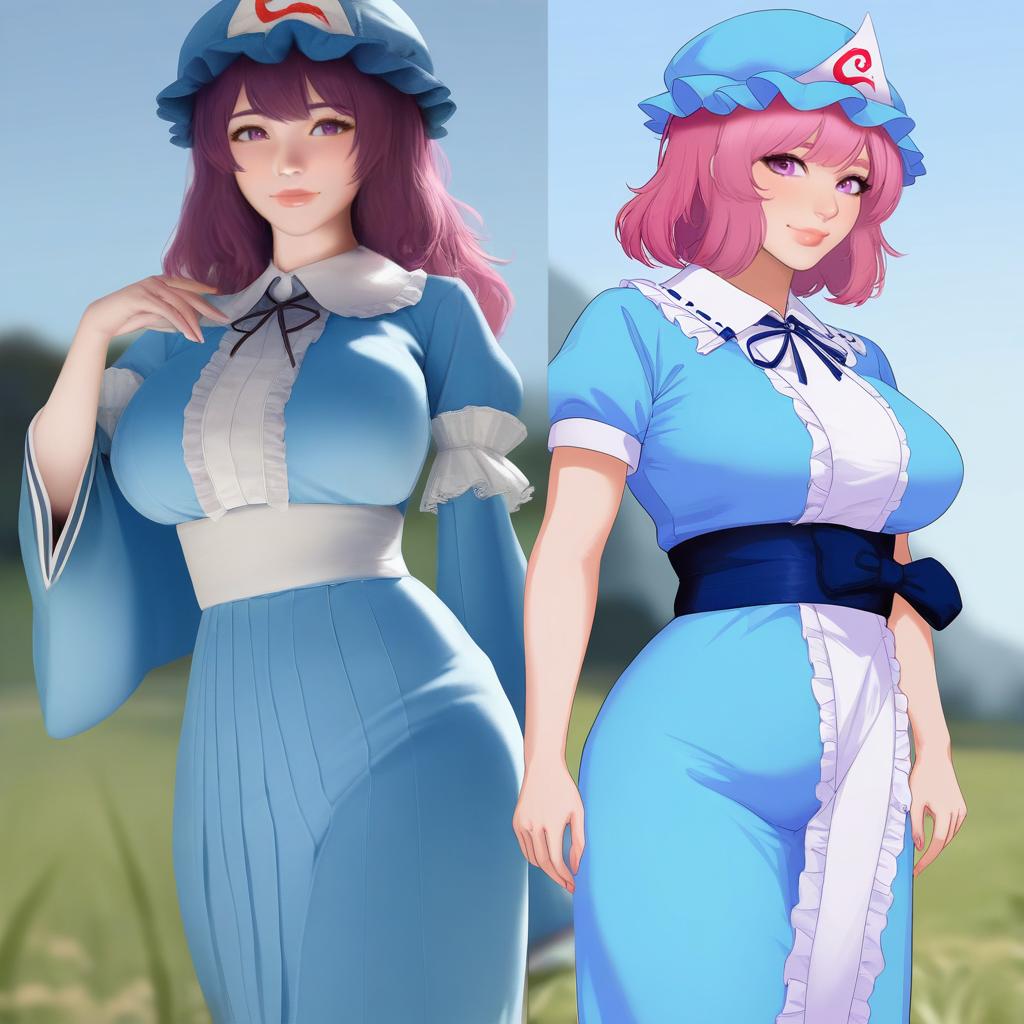 Saigyouji yuyuko, touhou, 1girl, pink eyes, pink hair, short hair, large breasts, blue kimono, hat, mob cap, triangular headpiece, realistic style, character, dark hair, long hair, purple eyes, curvy anatomy, confident pose, digital art style, summer vibe, light green cotton dress, forest clearing, soft filtered light, wildflowers
